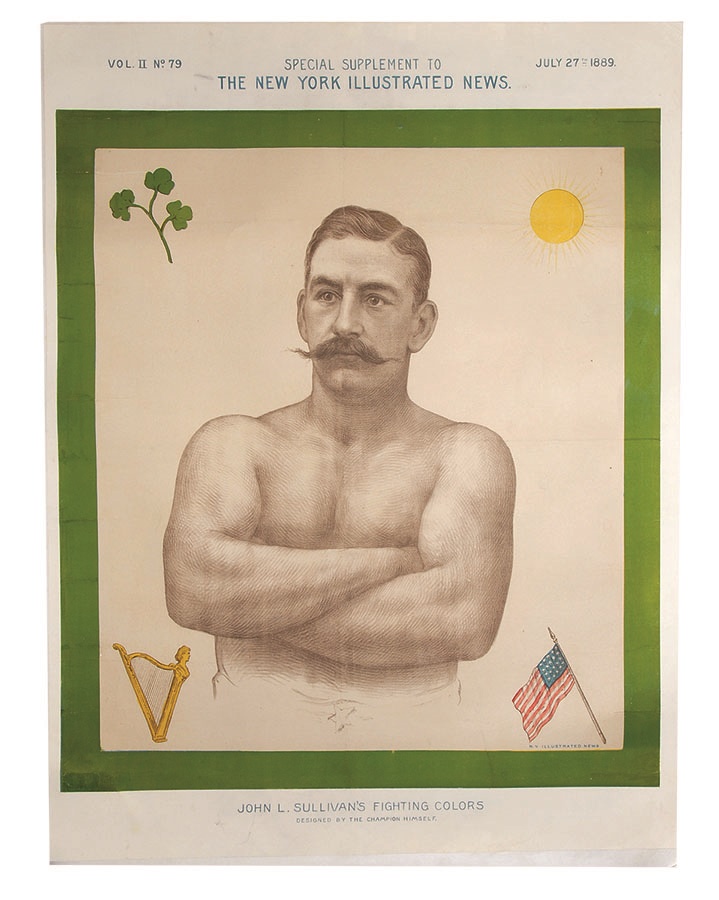 On July 8, 1889 in Richburg, Mississippi World Heavyweight Champion, John L. Sullivan met and defeated challenger Jake Kilrain in what would be the last defense of his title in bare knuckles. This fight was fought under the grueling heat and scorching sun typical of summer in the south. The fight lasted 75 rounds before Kilrain was forced to submit. Offered here is an extremely rare poster of John L. Sullivan issued by the New York Illustrated News to commemorate his victory over Jake Kilrain. This magnificent paper poster was issued as a special supplement by the New York Illustrated News. Dated in upper right corner, July 27, 1889. The poster pictures Sullivan in his famous bust pose with arms folded surrounded by his colors. The color is vivid with very little fading. Professionally linen backed. 28.5x36." Very minor surface wear. As fine a poster of Sullivan as champion as we have seen.