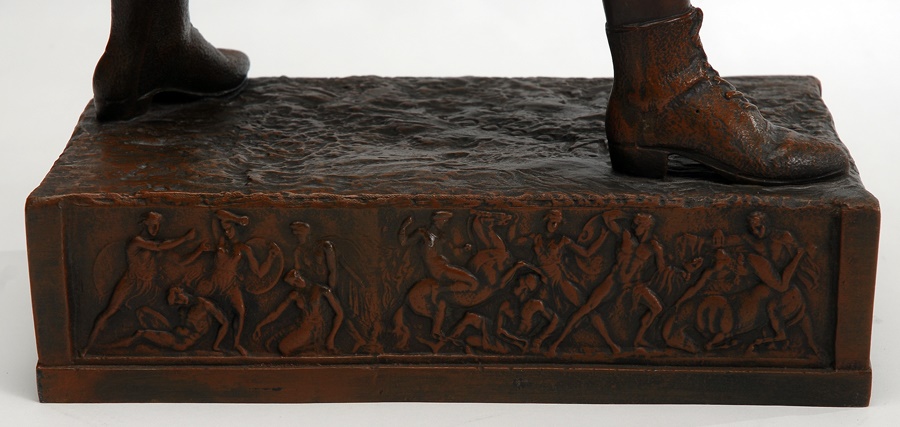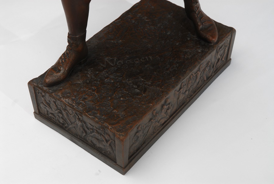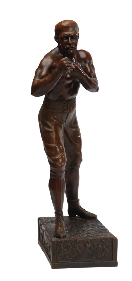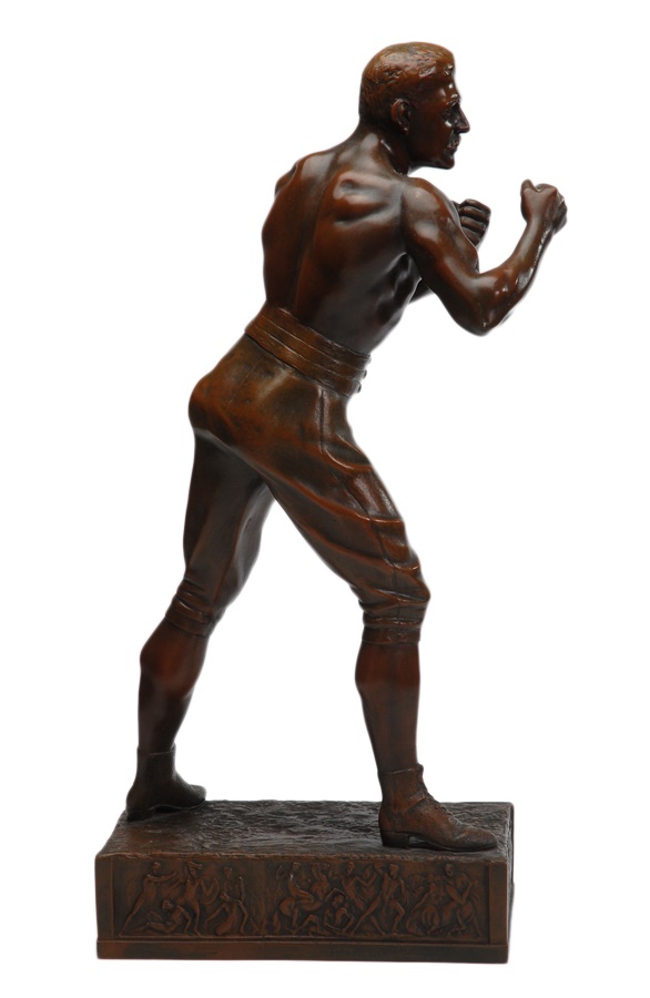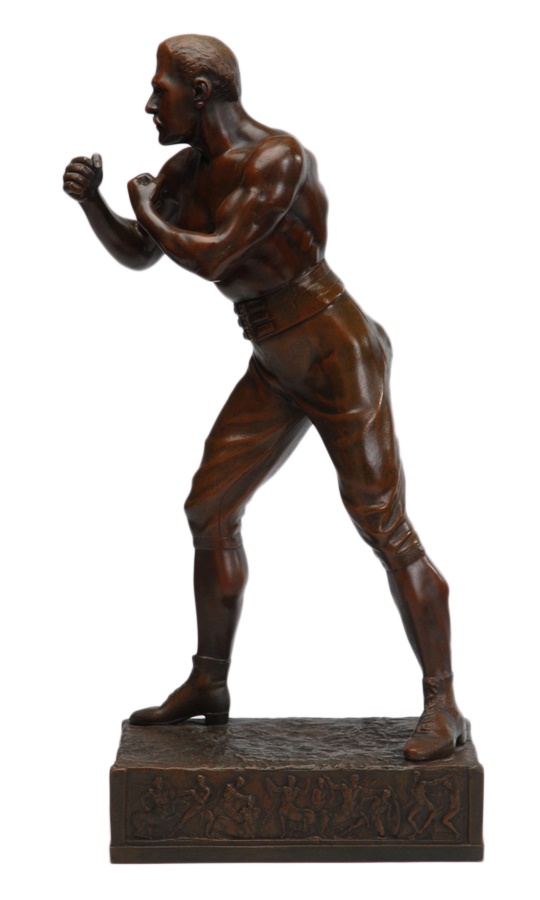 This magnificent bronze is of the great World Heavyweight Champion John L. Sullivan. It was done in the early 20th century. The fighter is in full boxing pose. He is bare fisted wearing boxing shoes and togs of the late 19th century. The magnificent ornately designed base has boxing scenes surrounding the perimeter. It is signed on the base by the German artist Waagen. This bronze is in magnificent condition. Beautiful aged patina. No scratches. 27" high. Base is 7x12."