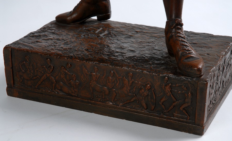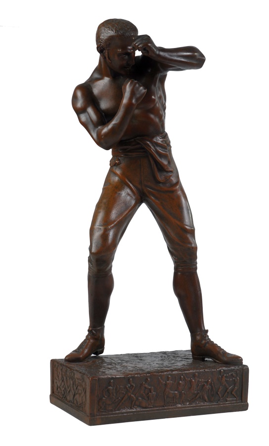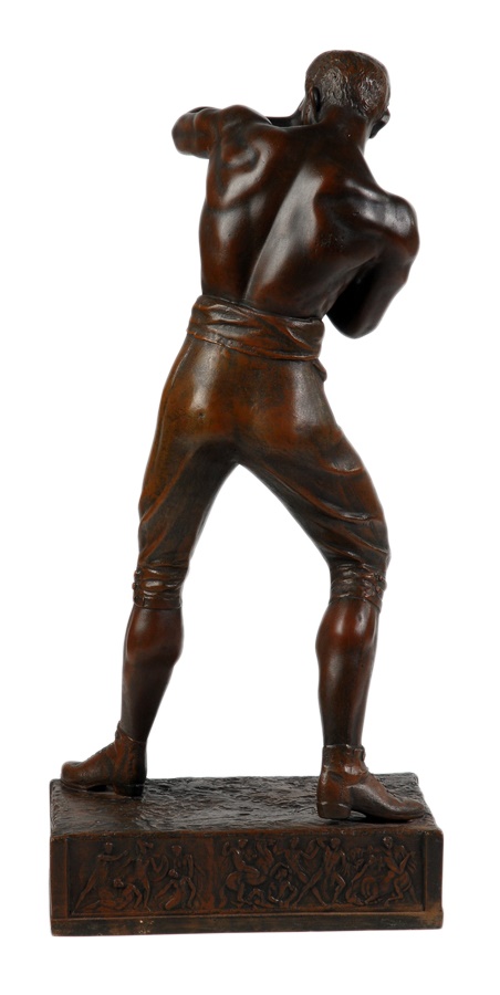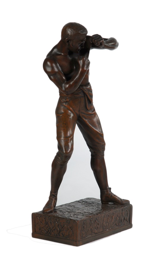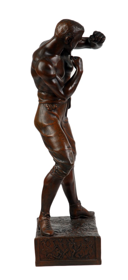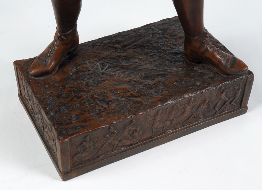 This magnificent bronze is of the great World Heavyweight Champion James J. Corbett. It was done in the early 20th century. The fighter is in full boxing pose. He is bare fisted wearing boxing shoes and togs of the late 19th century. The magnificent ornately designed base has boxing scenes surrounding the perimeter. It is signed on the base by the German artist Waagen. This bronze is in magnificent condition. Beautiful aged patina. No scratches. 27" high. Base is 7" x 12."