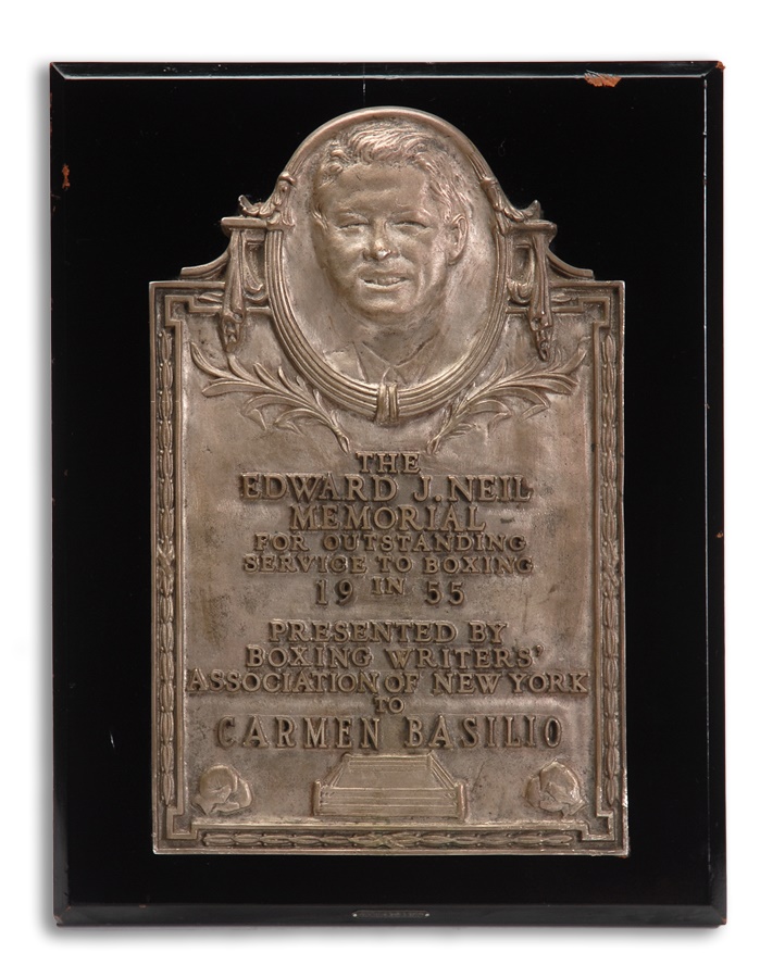 Offered here is the prestigious Edward J. Neil Award given to Carmen Basilio for his service to boxing in 1955. Basilio fought and won five times in 1955 with the highlights winning the World Welterweight Title with a stoppage of Tony DeMarco on June 10, 1955 and stopping DeMarco again in the rematch on November 30, 1955. The metal award mounted on a black wooden base is 12x16." Some chips to the wood, otherwise fine. Has a Lambert Bros tag at the bottom. The award reads, "THE EDWARD J. NEIL MEMORIAL FOR OUTSTANDING SERVICE TO BOXING IN 1955 PRESENTED BY BOXING WRITERS' ASSOCIATION OF NEW YORK TO CARMEN BASILIO. LOA from Carmen Basilio.