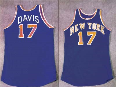 Wonderful blue and orange jersey was worn by the 6'7" forward as a member of the Madison Square Garden squad. "New York 17" spans chest, with "Davis 17" on verso. Collar tagging is "Cosby [size] 46 Long." Fine use. A tough find to be sure.