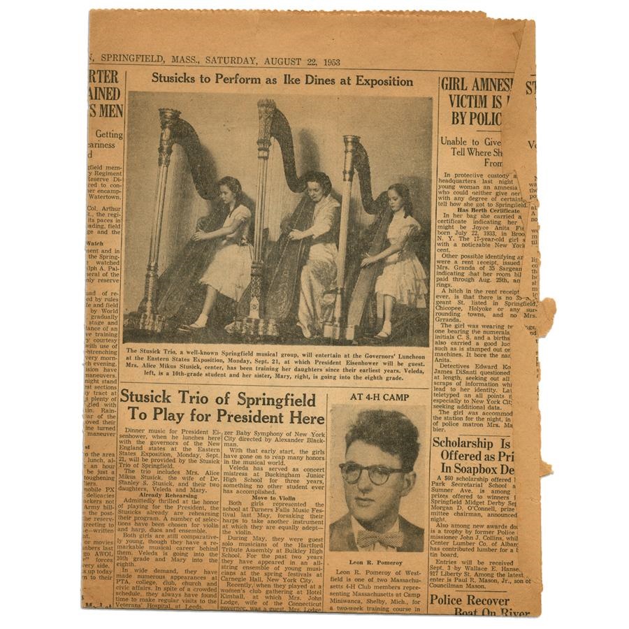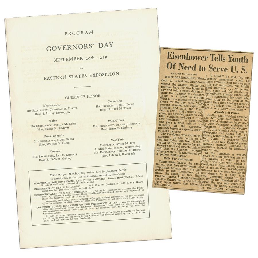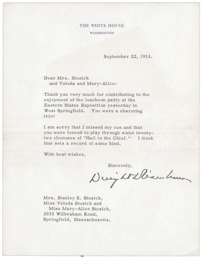 This lot of documents includes: a letter from The White House to a trio of women harpists and violinists (Stusick Trio) who performed at the Eastern States Exposition luncheon party. President Eisenhower signed this in black fountain pen, and joked that he was sorry he missed his cue and that the trio was "forced to play through some twenty-two choruses of "Hail to the Chief". The letter is dated, "September 22, 1953". The envelope was stamped with, "SEP 23 1953". Also included is a Governor's Day program from "September 20th-21st at Eastern States Exposition". There is a small newspaper clipping titled, "Eisenhower Tells Youth Of Need to Serve U.S." The last piece shows the Stusick Trio from The Springfield Union newspaper on Saturday, August 22, 1953. The title above the photo reads, "Stusicks to Perform as Ike Dines at Exposition".