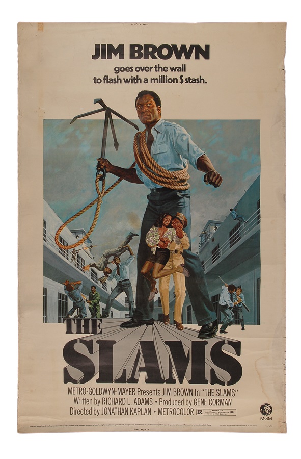 This hard-to-find poster shows one of the greatest players in the NFL, Jim Brown, when he starred in the movie "The Slams", in 1973. The poster measures 40x58", and has a water stain at the bottom right corner. The poster is a bit frayed along the left and right sides. The poster, especially the font, is in the typical style of the early '70's. VG.