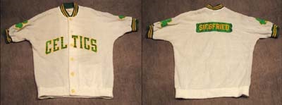 Great short-sleeved jacket gives us that warm and fuzzy feeling all over, as it must have done for Celtics hero Siegfried, who anchored five World Championship teams at Boston Garden. "Celtics" is announced from chest, with "Siegfried" nameplate snapped to the shoulders. Shamrocks on each sleeve. Button-front. Tagging in collar is "Wilson [size] 44." Definite use, but no damage to speak of makes this the prize possession of any Boston b-ball fan.