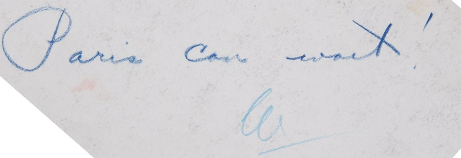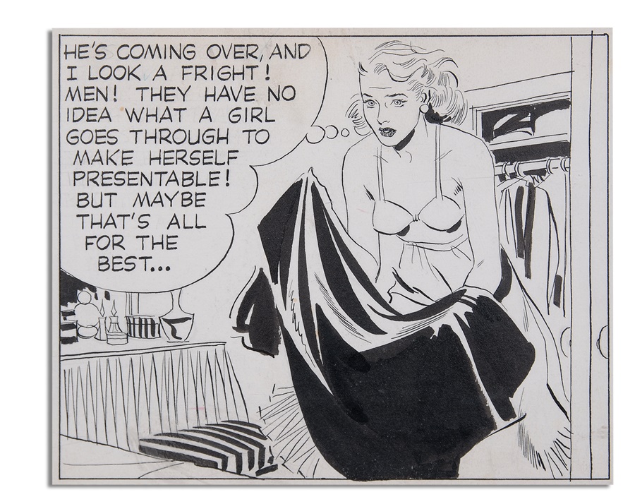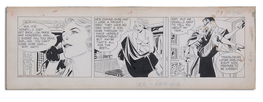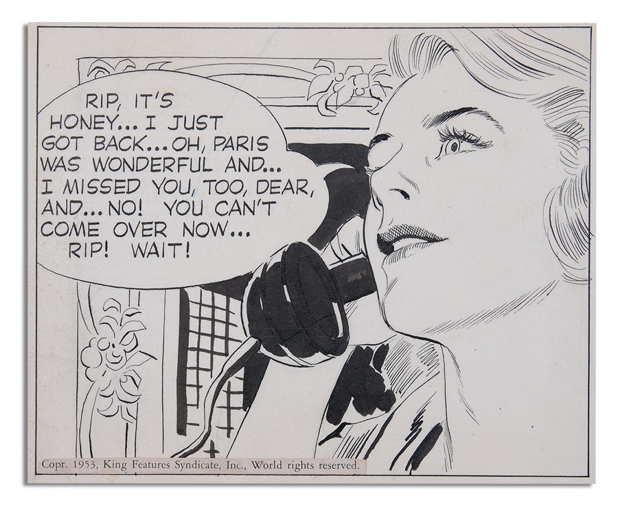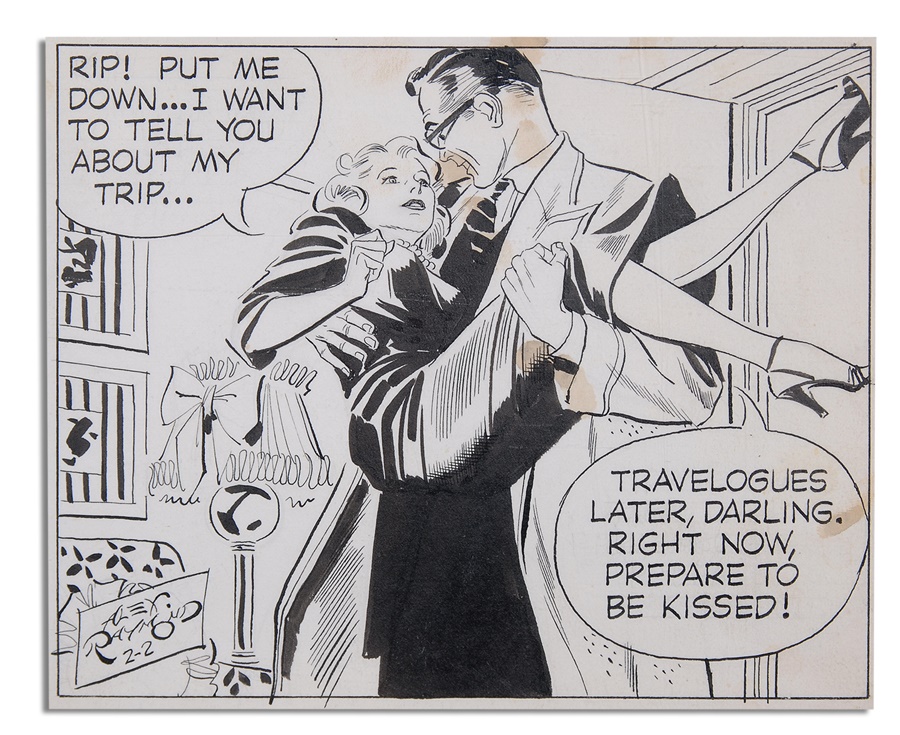 "Rip! Put me down...I want to tell you about my trip..." says Honey Dorian excitedly. "Travelogues later, darling. Right now, prepare to be kissed!" says Rip Kirby (even more excitedly). This piece of daily original art from 1953 titled "Rip Kirby" was created by the great Alex Raymond, who is famous for writing and illustrating Flash Gordon. This is one of the best dailies of Rip ever seen, as it features both main characters Rip and Honey. The back of the piece has the title written in navy colored pencil, which says, "Paris can wait!" There is a red stamp with "ANG Co. Inc Photoengravers" on it. The bottom left corner of the front piece says, " Copr. 1953, King Features Syndicate, Inc., World rights reserved."