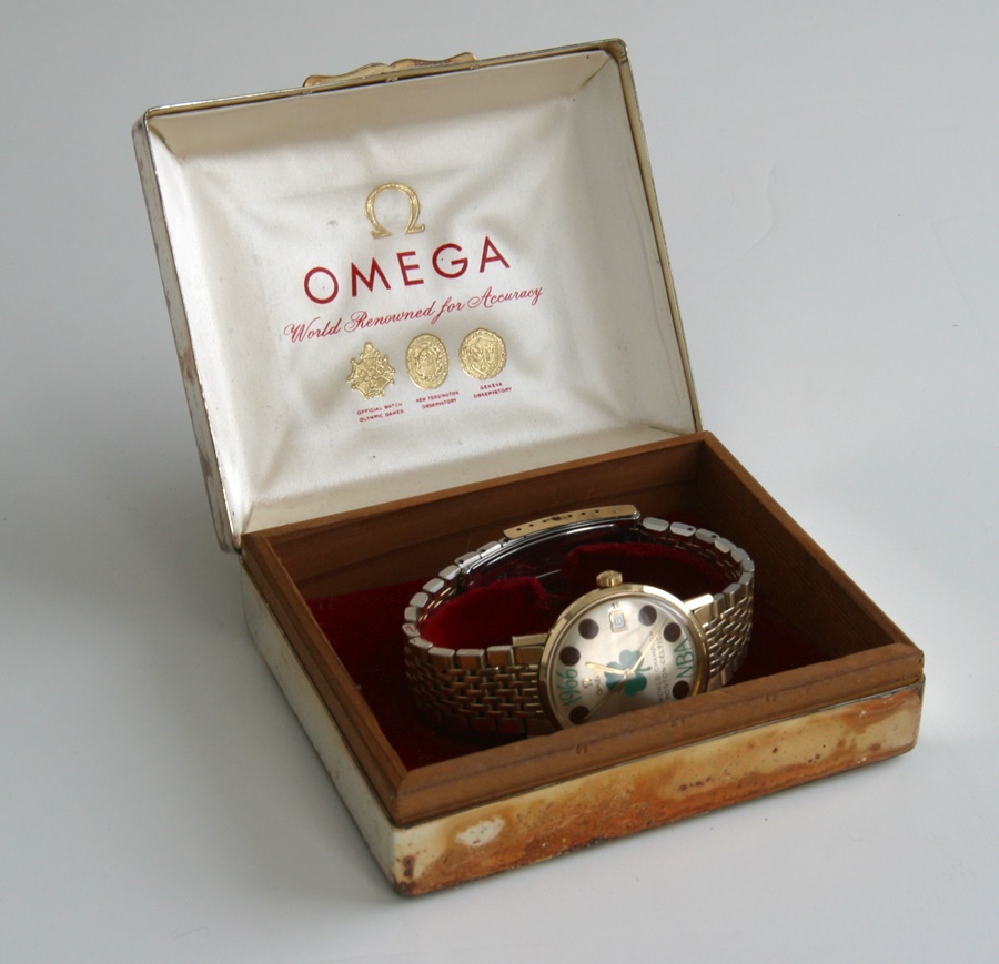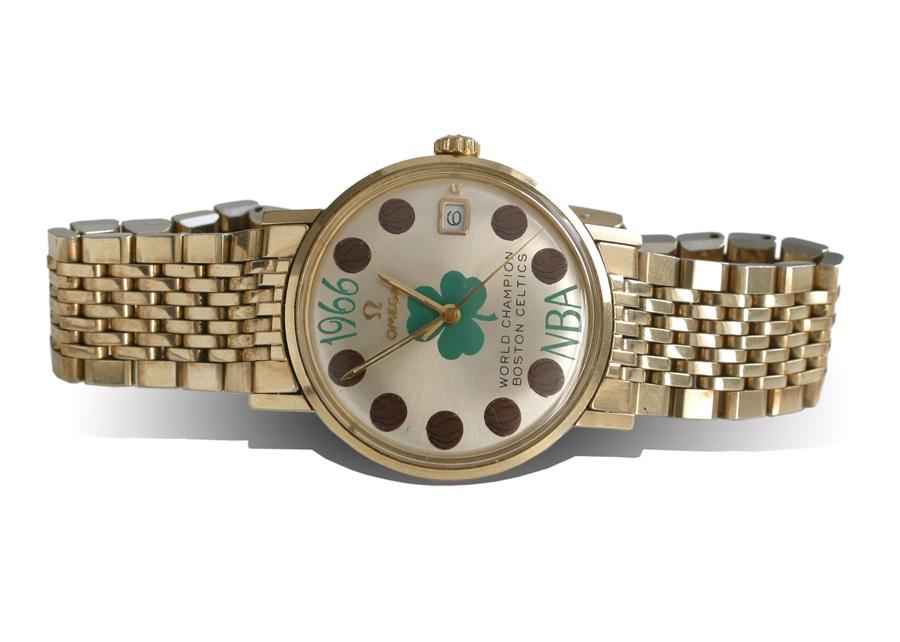 The Boston Celtics players only received one ring during this era. If a player won a Championship in a prior year, he would not receive another ring. Instead, he would get a watch like this one. The high quality 14K gold Omega Seamaster watch says "1966, Omega, World Champion Boston Celtics, NBA" on the face. It runs but needs a bit of tuning to keep the time properly. The watch, in EX-MT condition, comes with its original box. LOA from Ron Bonham.