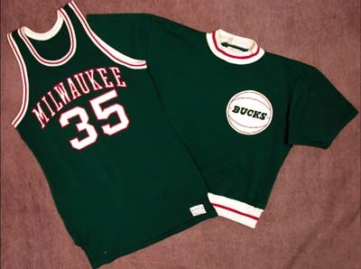 Tough early jersey shows strong use from the hardcourt, with "Milwaukee 35" on chest and "35" on verso. "Sand Knit Size 44" tail tagging. Matching shooting shirt has great "Bucks" logo basket-ball patch on chest, with white and red elasticized trim. Collar tagging is also from "Sand Knit" and shirt shows fine use as well. We all know how tough early basketball stuff is, so you should perk up your ears when you hear about it.