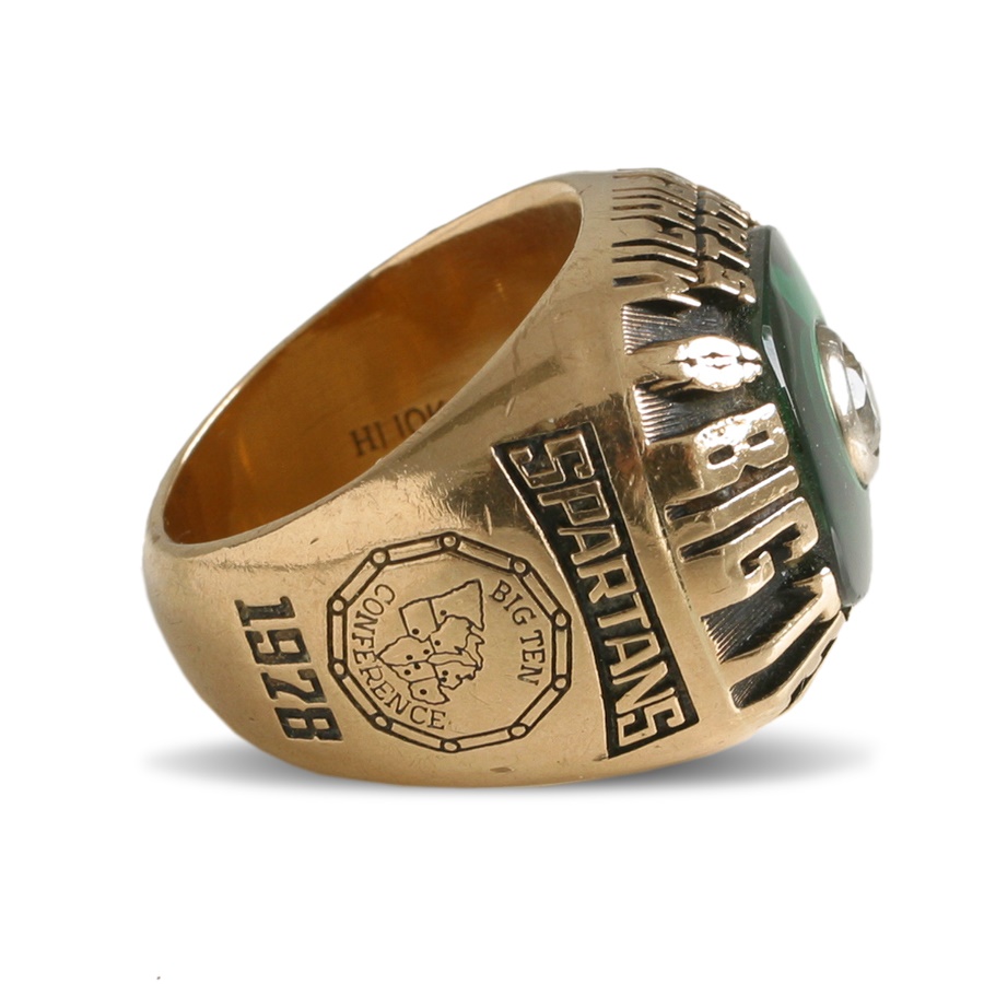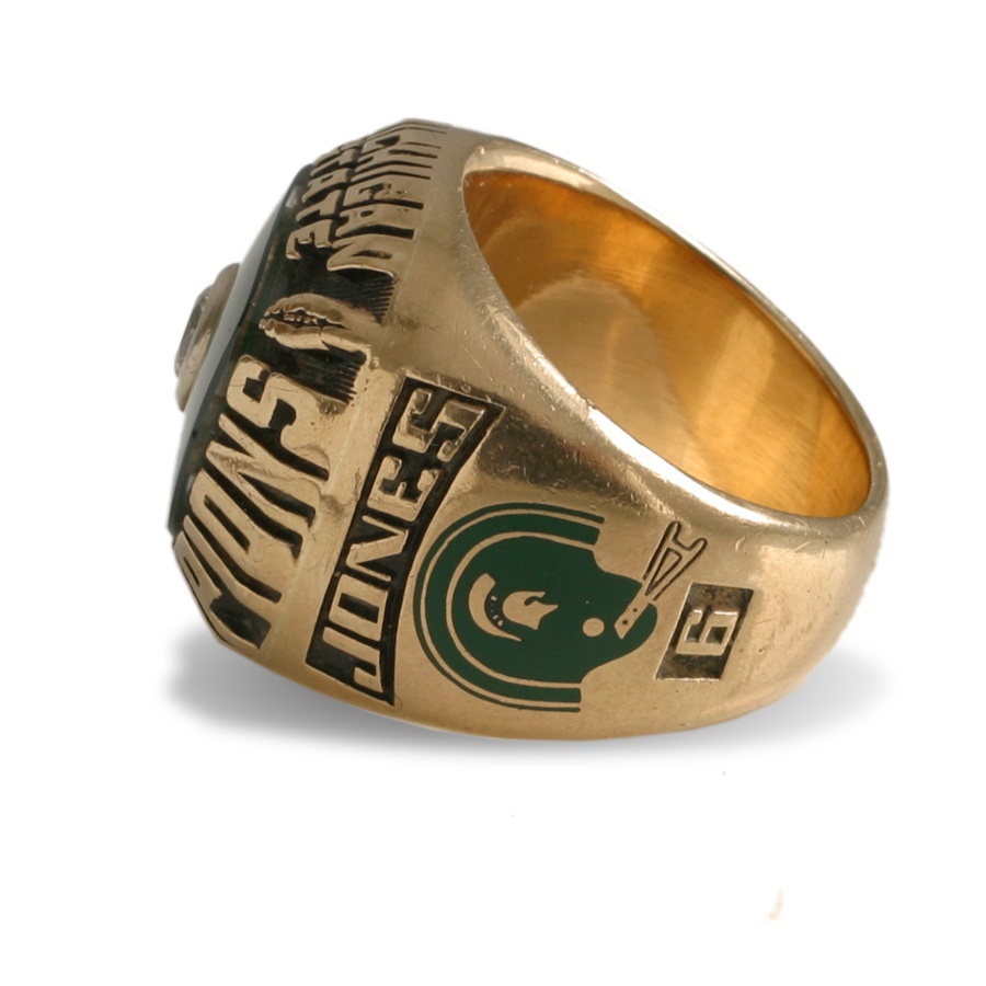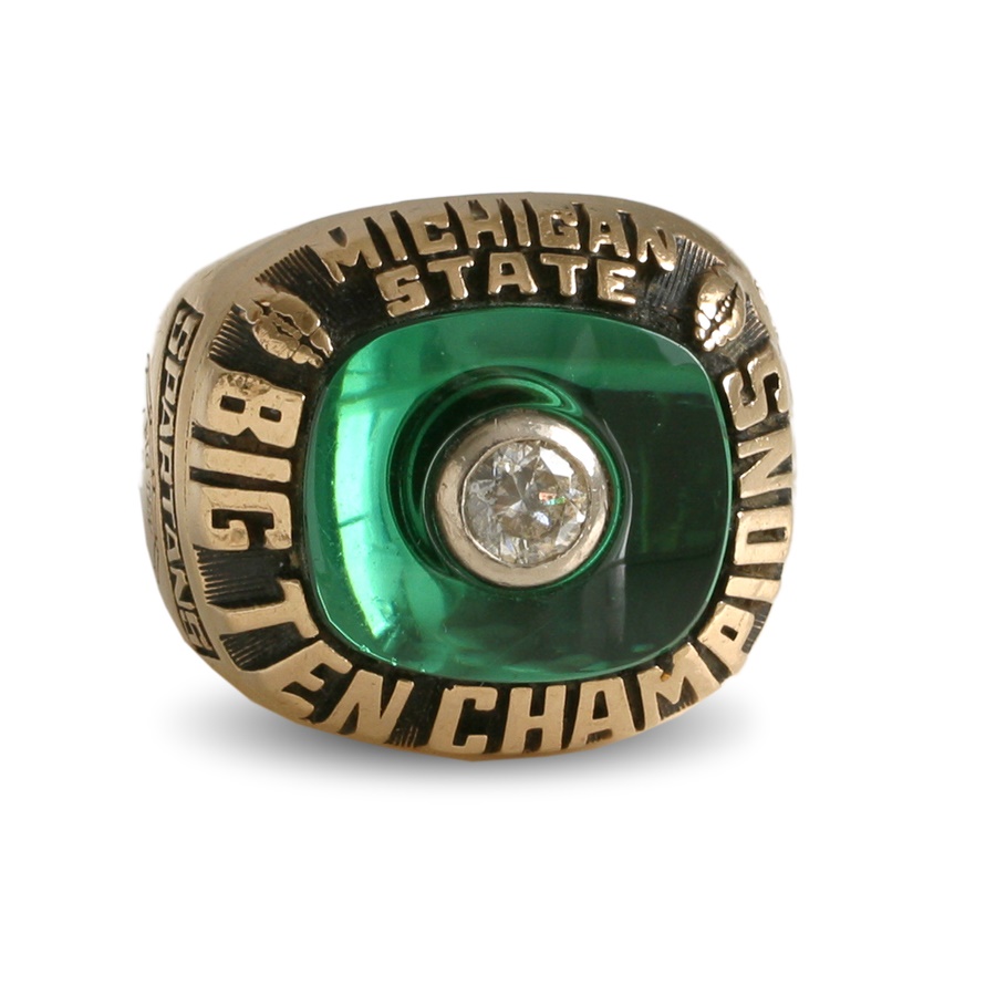 This was a player's ring: Rick Jones, #6, played football for the Michigan State Spartans under coach Darryl Rogers. The inside of the Herf-Jones ring has been stamped with, "HJ 10K". One side of the ring reads, "Spartans, Big Ten Conference, 1978". The other side says, "Jones, 6". The face of the ring has one glass (faux) diamond in the center, with a green stone background. Around the face of the ring it says, "Michigan State, Big Ten Champions". Size 8. EX-MT.