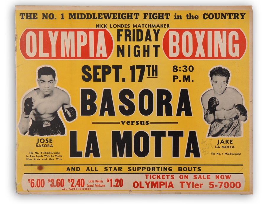 On September 17, 1943 at the Olympia in Detroit middleweights Jake LaMotta and Jose Basora squared off in an important division match which was won by LaMotta by unanimous decision. Offered here is an on site poster from the event. It is cardboard measuring 22x28." The images are bold and the color still crisp. Minor edge and corner wear. Generally clean. A very nice example of a scarce poster from the early career of Jake LaMotta.