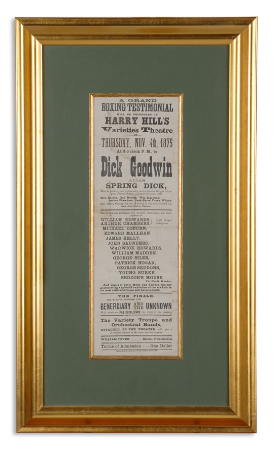 Offered here is an extremely rare boxing broadside dated November 4, 1875 for an event at the famous Harry Hill's Variety Theatre. Appearances by Billy Edwards, Arthur Chambers, George Siler and many others. The headliner was Dick Goodwin (featherweight champion). 6x17." Professionally framed. Minor staining. Bold print. Exceptionally rare and likely unique. Broadsides from this era of boxing are nearly impossible to find.