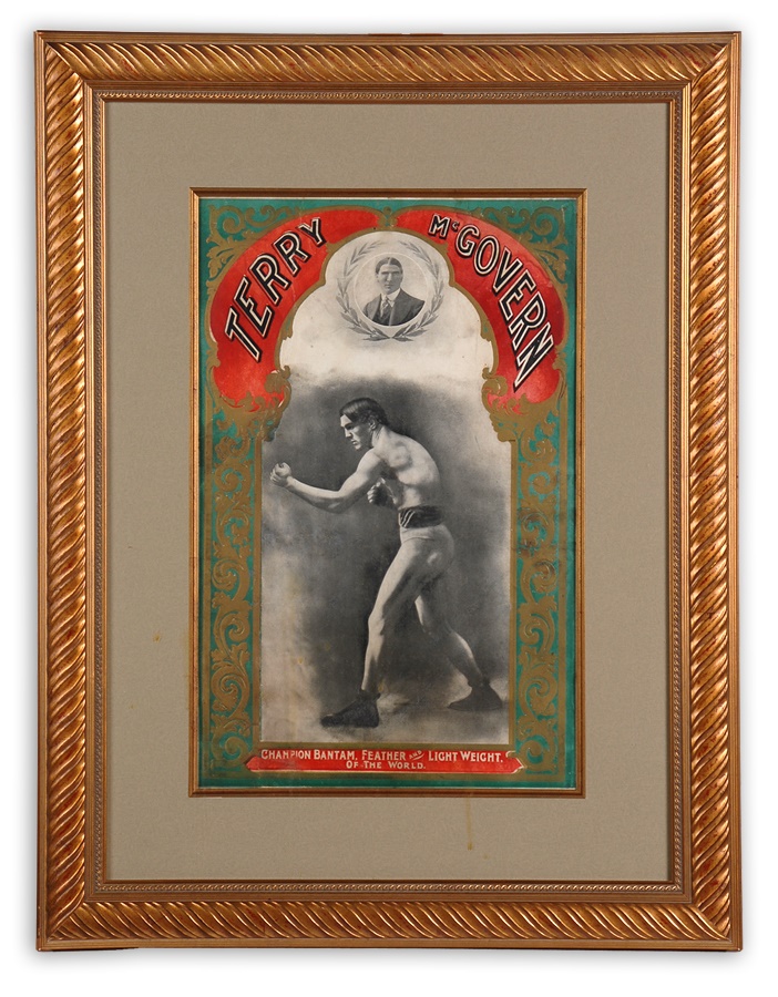 Terry McGovern was one of the most significant world champions in the early 1900's. He won the Bantamweight and Featherweight titles and scored career victories over Harry Forbes, Joe Gans, George Dixon, Harlem Tommy Murphy and Frank Erne. Offered here is a magnificent early 20th century promotional poster of Terry McGovern. 14x21." Ornately designed cardboard poster with bold color and images. Minor edge and surface wear. Professionally framed. Exceptionally rare.