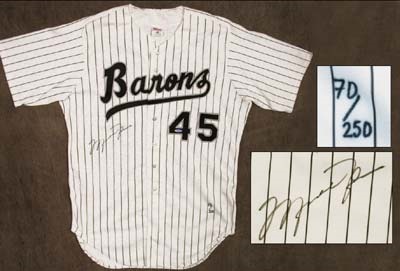 Jersey One of the rarest (this is limited edition number 70/250) and most desirable of the basketball superstar's Upper Deck autographed pieces. Perfect replica of the jersey MJ wore during his brief minor league baseball career is signed in perfect black sharpie. All authenticating stickers and paperwork is, of course, included.