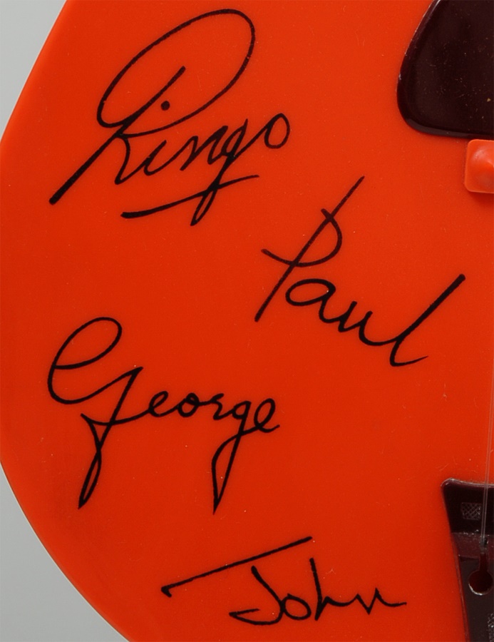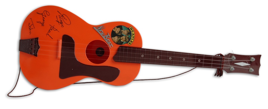 This bright orange, 32" long, four-stringed guitar was made in England in 1964 by Selcol. It features a Beatles sticker on it, and comes with a rope cord to keep around the body when playing. The guitar comes in its original box (VG) with a Beatles sticker on the outside of the box. The guitar is graded NRMT.