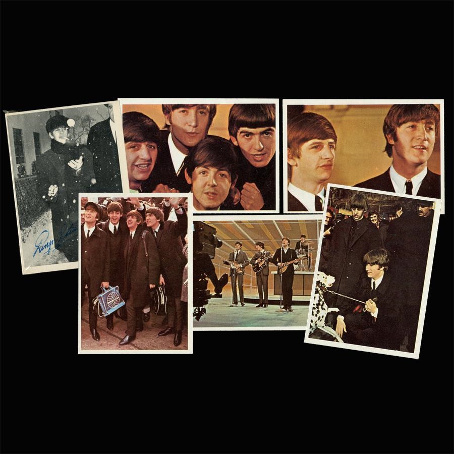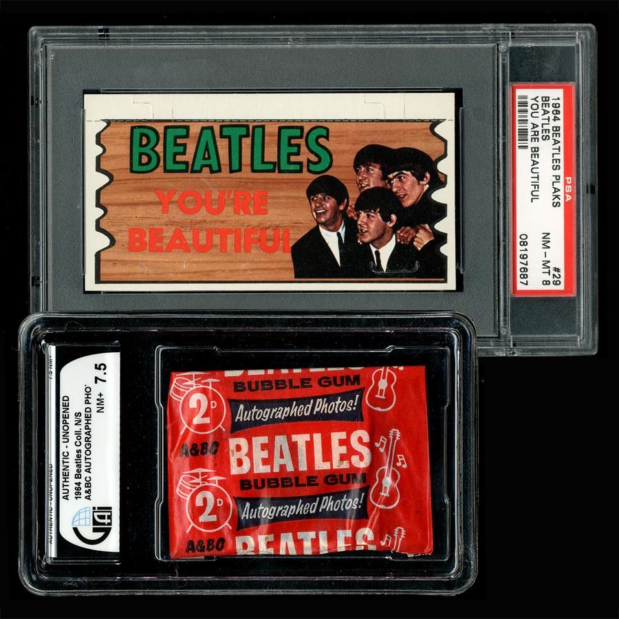 This lot includes one opened pack of "Beatles Color Cards". The opened pack includes ten different full color cards. The unopened pack shows the top black and white card, with Ringo Starr smoking a cigarette and his signature at the bottom in blue. The back card has "2nd Series (#61 Through #115) No. 72" printed at the bottom in red. Next in this lot is a graded, unopened 1964 "Beatles Bubble Gum Autographed Photos!" pack. NM+. 7.5. Also included is a PSA graded 1964 "Beatles Plaks" which says, "Beatles You're Beautiful". #29. NM-MT. 8.