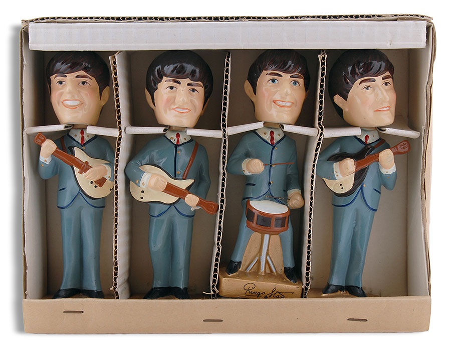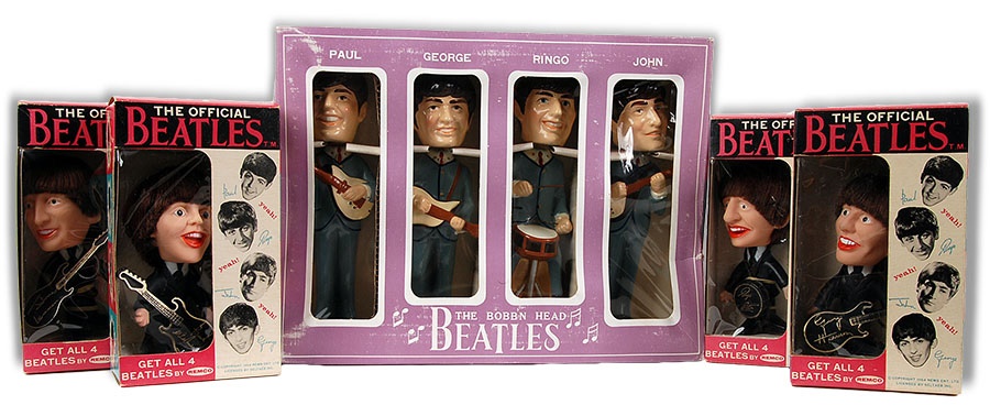 "Start a screaming team with your own, George, John, Ringo, and Paul...that make you glad, glad, glad...", says the writing on the backs of these boxes. The 1964 Remco dolls, in their original, individual boxes (EX) feature the "Liverpool Lovables" each holding a guitar. The dolls, full of expression, are graded NRMT. The second half of this lot includes a 1964 set (in its original box, VG) of "The Bobb'n Head Beatles" (NRMT).