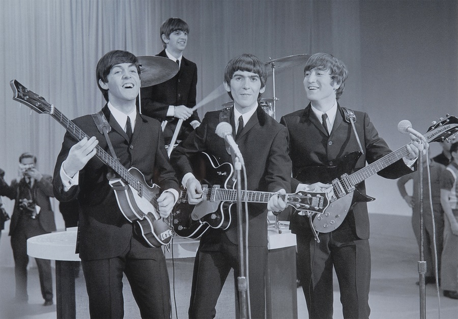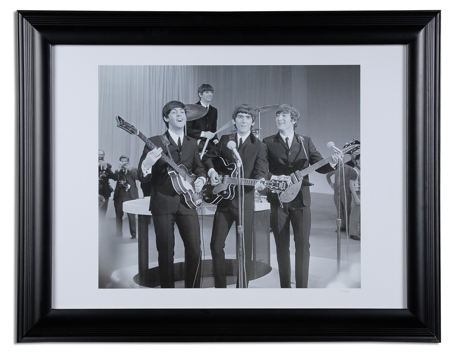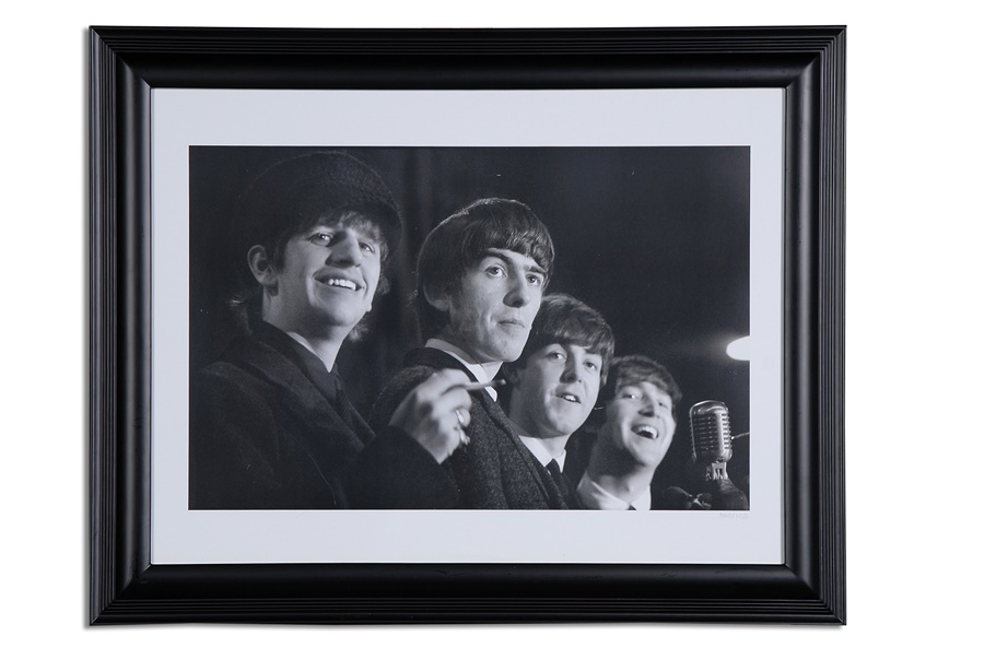 These two framed (22x28.5") black and white photos of The Beatles are both limited editions. One shows them performing on a television show, with George looking straight at the camera and a smiling John looking at him. This piece has been numbered "91/2000" in pencil at the bottom right corner. The second piece has Ringo at the forefront, donning a cap and holding a cigarette, with George, Paul, and John standing next to him. The piece has "360/1100" at the bottom right corner, also in pencil.
