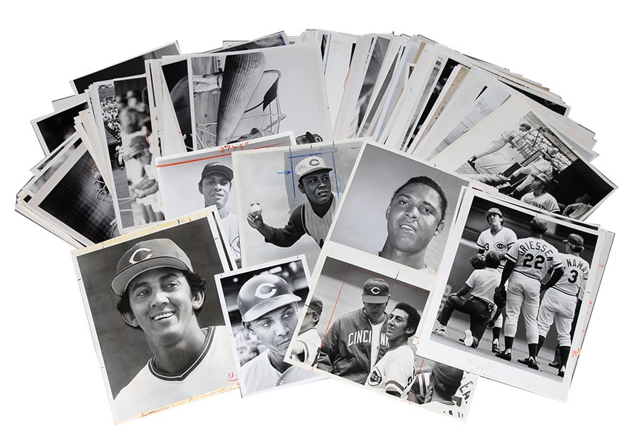 1960s-80s vintage photos are magnificent specimens from the Cincinnati Enquirer. From these three great players: Dave Concepcion (73), Tony Perez (57) and joe Morgan (54). There is lots of early stuff, with their teammates, behind the scenes, lots of on field action, locker room, and more. Some great stuff. Many with original newspaper articles and photographer’s stamps affixed to the versos. Overall EX-MT. Most 8x10”.