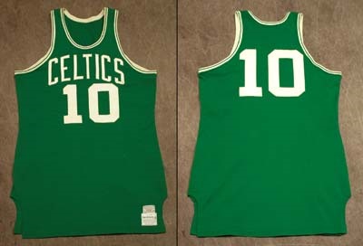 He averaged over twenty-one points a game this season, and made his first of seven consecutive trips to the All-Star Game. Nicely worn green road knit jersey announces "Celtics 10" on chest, with number "10" again on verso. "Musinksy's Sand Knit size 42" tagging in tail. A terrific first jersey from this hardcourt superstar. LOA.