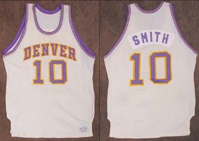 Any jersey collector will tell you how tough A.B.A. jerseys are, and this one is a fine example. White gamer has "Denver 10" in purple and yellow across chest, with "Smith 10" on back. Name plate is restored, most likely by the team. Tail tagging is "Sand-Knit size 42." They just don't make them like this anymore.