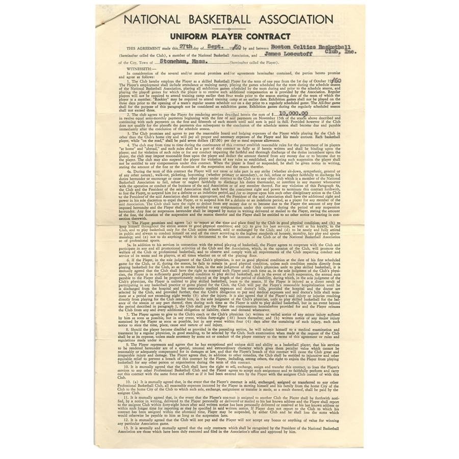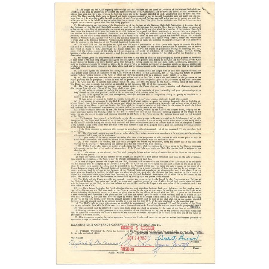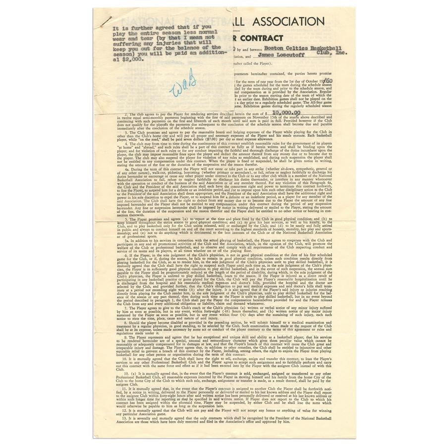 This contract was signed by Jim Loscutoff and Hall of Famer Walter Brown, who has also initialed the addendum (in blue fountain ink) which is stapled to the front of the contract. The signatures on the back, in ballpoint pen and fountain ink, are graded an 8/10. The contract is dated, "OCT 24, 1960". Though the contract has some mailing folds, it is otherwise in EX condition.
