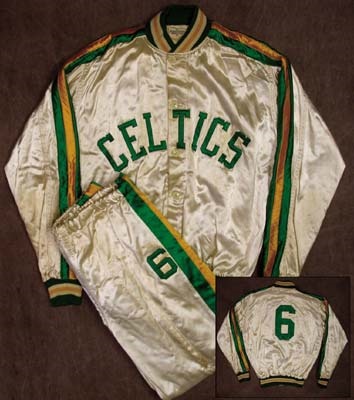 Don't plan on wearing this shimmering satin ensemble unless you're about two inches short of seven feet-you'll just look foolish. But then, Russell made hundreds of N.B.A. opponents look foolish during his Hall of Fame career. He wore this suit at the beginning of that career, and the number "6" on the back of the jacket and at the hip of the pants still burn as brightly as they did while he drained 25-foot set shots during pre-game warm-ups. "Celtics" adorns chest in perfect green. Soft cotton lining inside is lightly stained with the legend's sweat and tagged "Horace Partridge [size] 44, Large." Pants tagged"Wilson [size] 36." Amazingly, this suit was purchased by a thirteen year old kid from a friend's father who worked clean-up at Boston Gardens. The kid had no idea who had owned it previously but liked the look of it and spent pennies to acquire what he would discover years later to be a piece of great importance. Letter of authenticity from that lucky soul is included.
