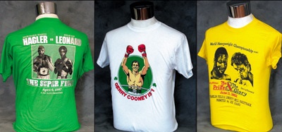 A collection of seventeen t-shirts worn by the staffers at Joe Hand Productions in Philly (with advertising on many) for the closed circuit showings of these colossal fights; Ali-Foreman, Tyson-Spinks, Leonard-Hearns II, Hearns-Hagler, Hagler-Leonard 1987 (4), Cooney (2), Leonard-Duran III, 1981 Hearns-Leonard, 1983 Hagler-Duran, Holmes-Cooney (2), Hearns-Shuler, Ali-Holmes, RESEARCH. These were not available to the general public. Sizes range from M to L. EX-MT.