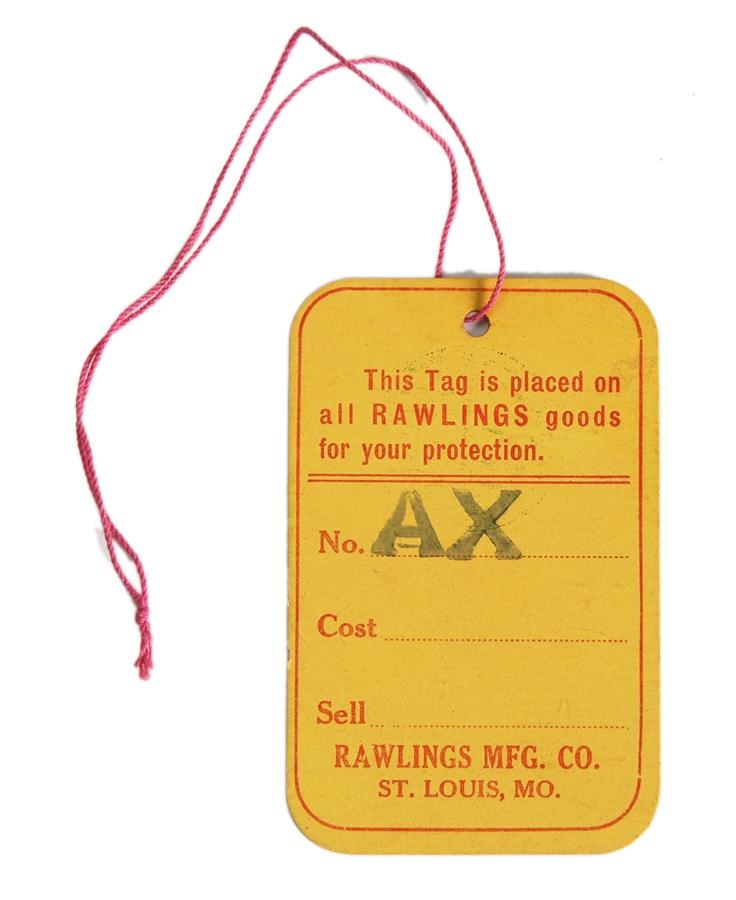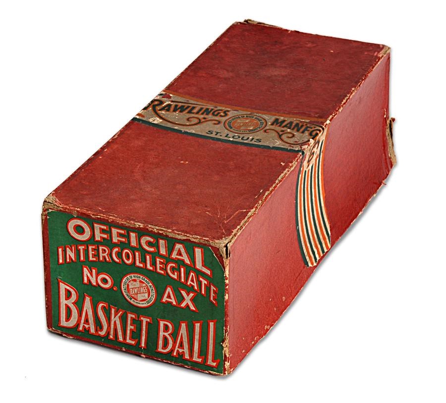 This original Rawlings box measures 5.25x12.75x4.24". It says "Rawlings Manfg. Co., St. Louis" on the top of the box, and "Official Intercollegiate No. AX Basketball" on the side of the box. The original yellow label is still in the box, and is marked with "AX" as the number, too.