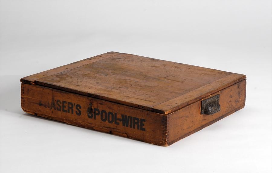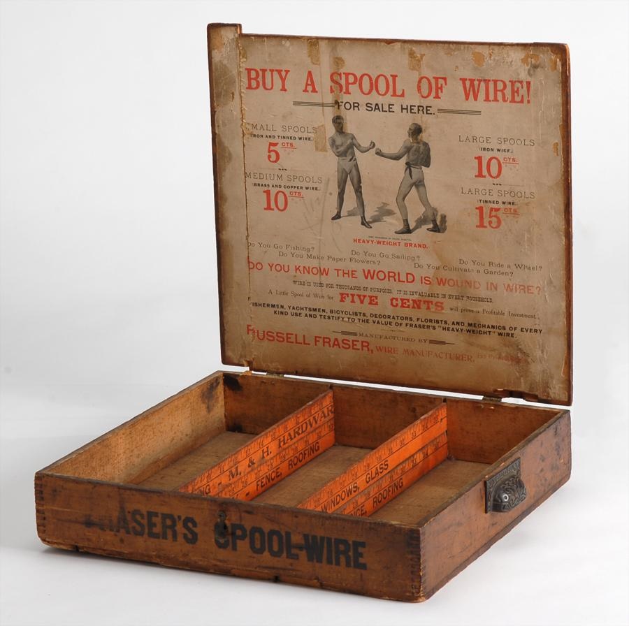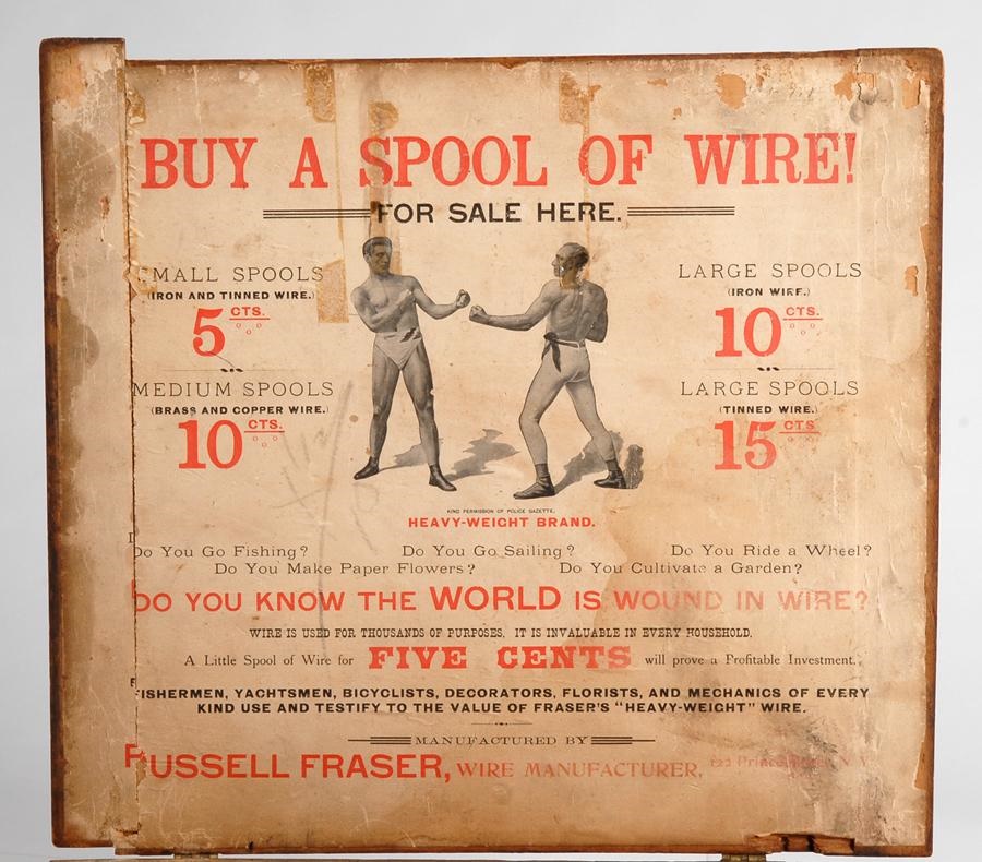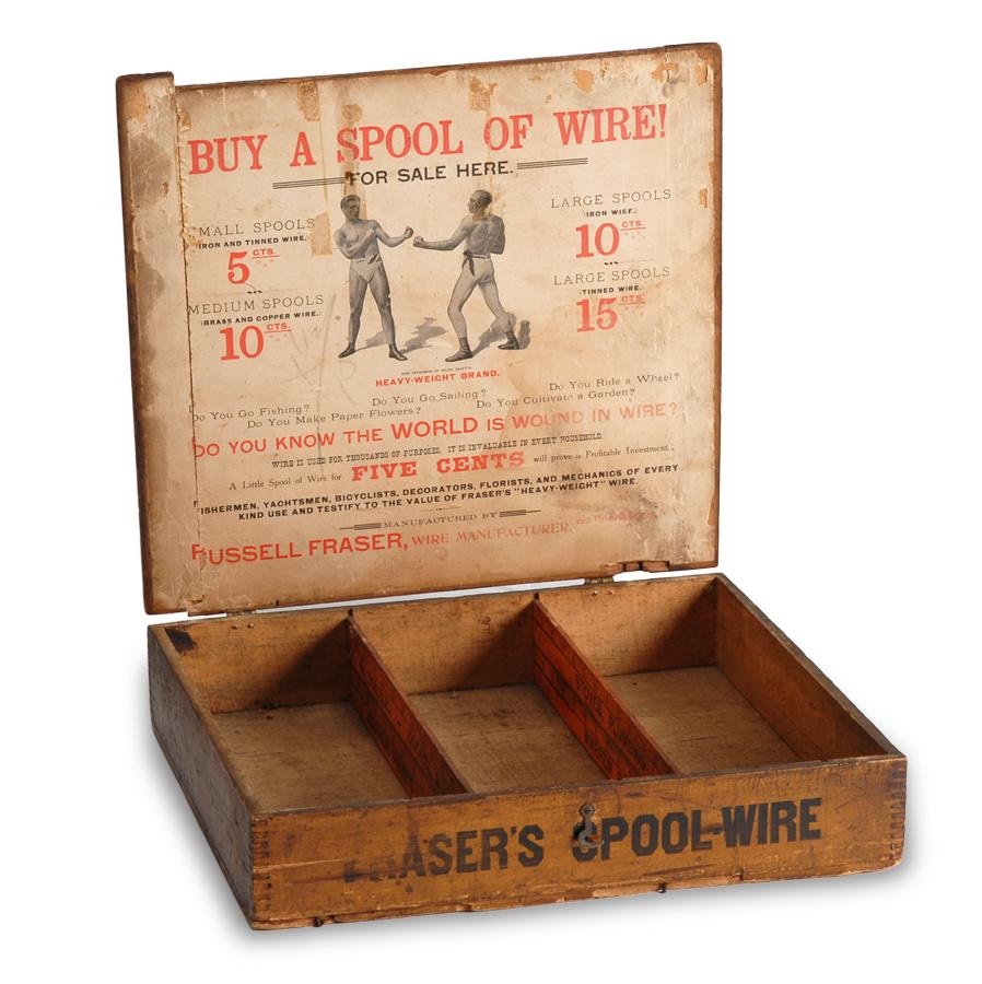 Absolutely magnificent “Heavyweight Brand” boasts paper litho on wood inner label image right out of the pages of Richard Fox. The boxers illustrated don’t just look like Corbett and Fitzsimmons, they ARE the boxers. One of two we have seen, this is the better of the two. 14x16x3”. Russell Frazier Wire Manufacturers is the company, and there is wood-burned period advertising on the outside as well. VG-EX. Corbett, a San Francisco native, was known to some as the "Father of Modern Boxing" while Fitzsimmons, a Brit, distinguished himself as the sport's first three-division world champion.