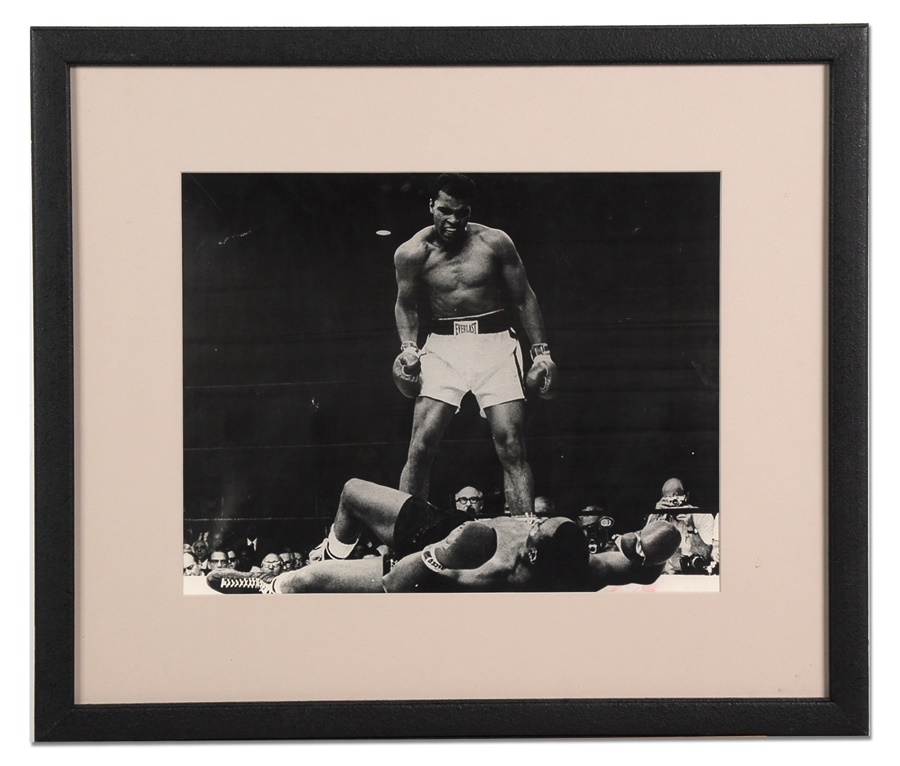 This vintage print captures the 1965 heavyweight championship rematch in Lewiston, Maine (only 2,434 fans saw this fight) between Sonny Liston and Muhammad Ali -- two of the greatest fighters of all time. The famous photo shows Liston lying on the ring floor with Ali screaming and motioning at him to "Get up and fight!” after knocking him out in the second round to retain the title. The fight and the photo became a part of Ali's legend and American folklore. The picture is enclosed inside a 29.5x25.5" black frame with a white background. This is perhaps the most famous boxing photo ever taken.