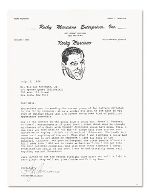 Tremendous content regards anoth-er pugilistic great. "…there were some stories that quoted me as say-ing I didn't think much of Johansson. The truth is I never said anything of the sort…" Official "Rocky Marciano Enterprises, Inc." letterhead is NRMT, as is the closing blue ink signature.