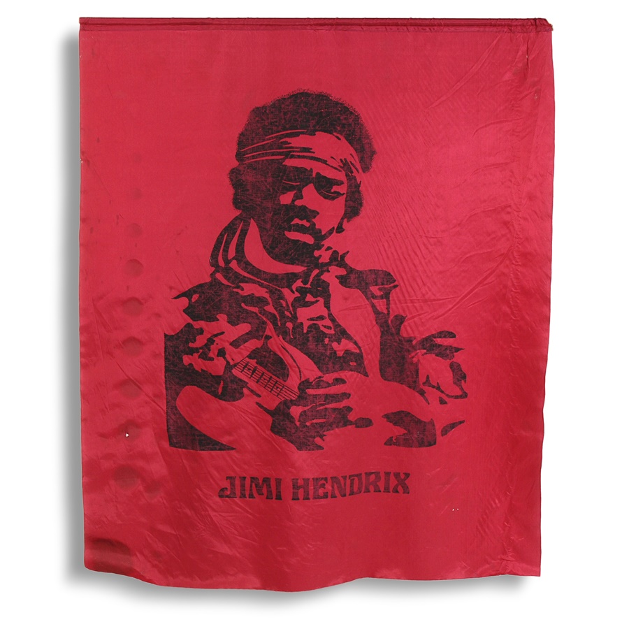 This Jimi Hendrix banner measures 48x54" and is black ink printed on a satiny burgundy fabric and hung from a wooden dowel. While the exact age of this piece is unknown, it looks unmistakably 1960s, with Hendrix's portrait and name in black. The piece does show some age: the banner has several dark stains down the left side, one of which has a small hole, and the black ink is faded. Overall it is a great piece of memorabilia from a rock legend who is considered one of the most important and influential musicians of his era.