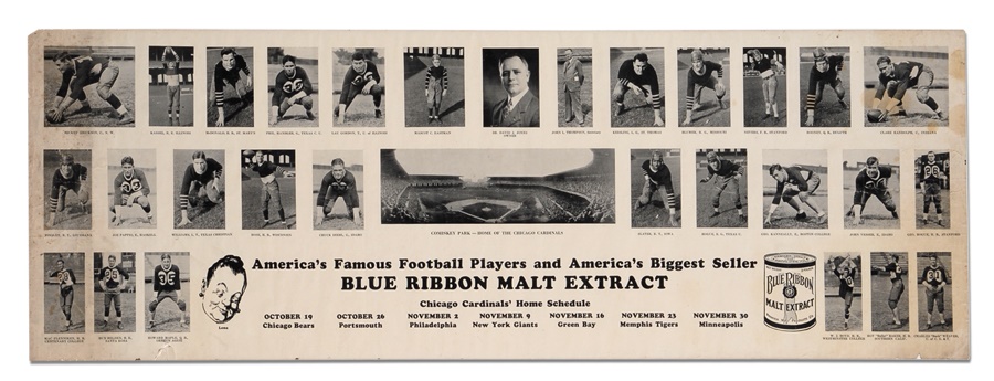 This rare panorama advertising of Blue Ribbon malt extract features The Chicago Cardinals team including tackle Duke Slater and fullback Ernie Nevers. This rare work has the club's home schedule and a great photo of Comiskey Park in the center along with pictures of the players. EX, 37.5x12.5".