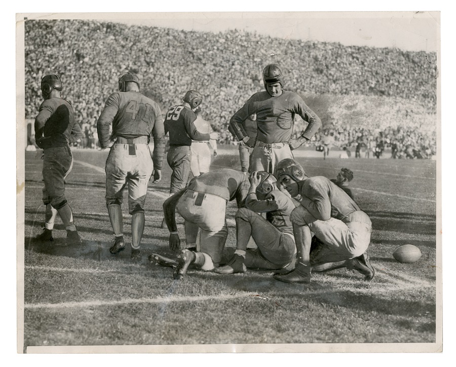 On January 1, 1929, Cal faced Georgia Tech in Pasadena, California. Midway through the second quarter, Roy Riegels picked up a fumble by Tech's Jack "Stumpy" Thomason. Just 30 yards away from the Yellow Jackets' end zone, Riegels was somehow turned around and ran 65 yards in the wrong direction for a safety. This rare original wire photo shows Riegels being consoled by his teammates after his gaffe. A purple stamp of when the photo was completed (July 9, 1929) is on the back and the photo comes with a description of the famous play.