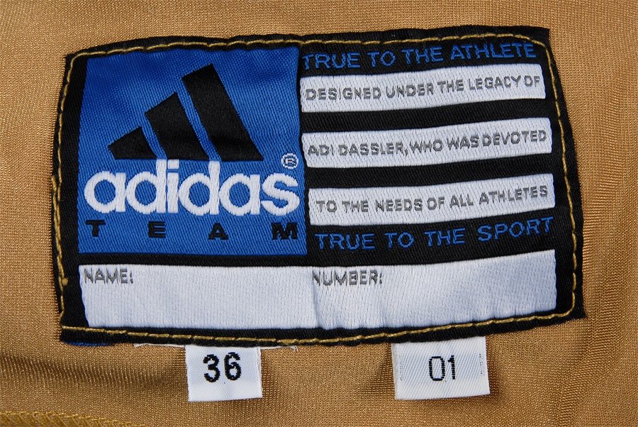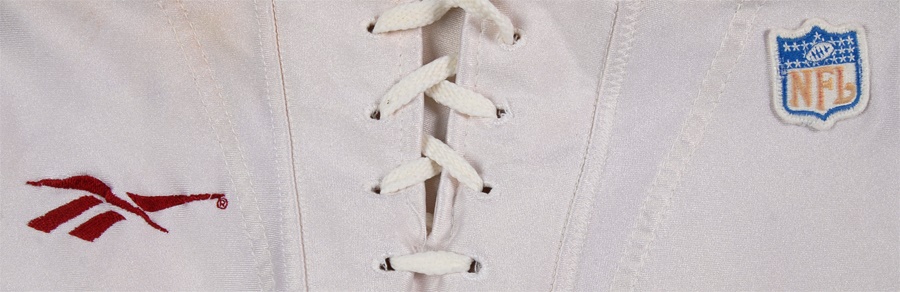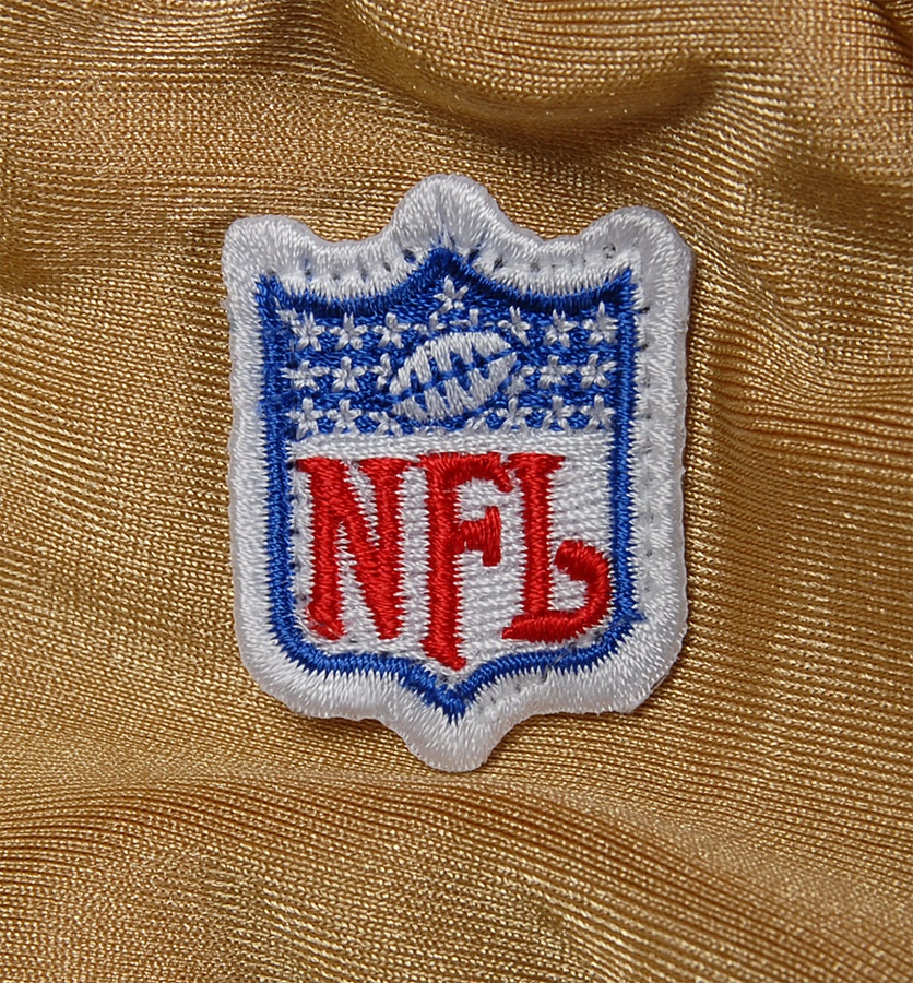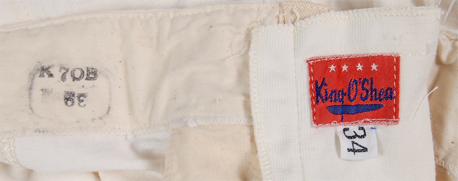 This lot includes: one pair of used white practice pants from 1955, size 34 with a "King O'Shea" label. The pants have "K7OB, 39" stamped inside the waist in black. The next pair are white game-used pants from 1994 with black and red stripes. A couple of pink stains shows where the red stripes have bled. The Reebok label inside shows they're a size 34. The last pair are gold with red and black stripes, and have the NFL tag on the front. The Adidas label on the inside shows they're a size 36, with an "01" label next to the size.