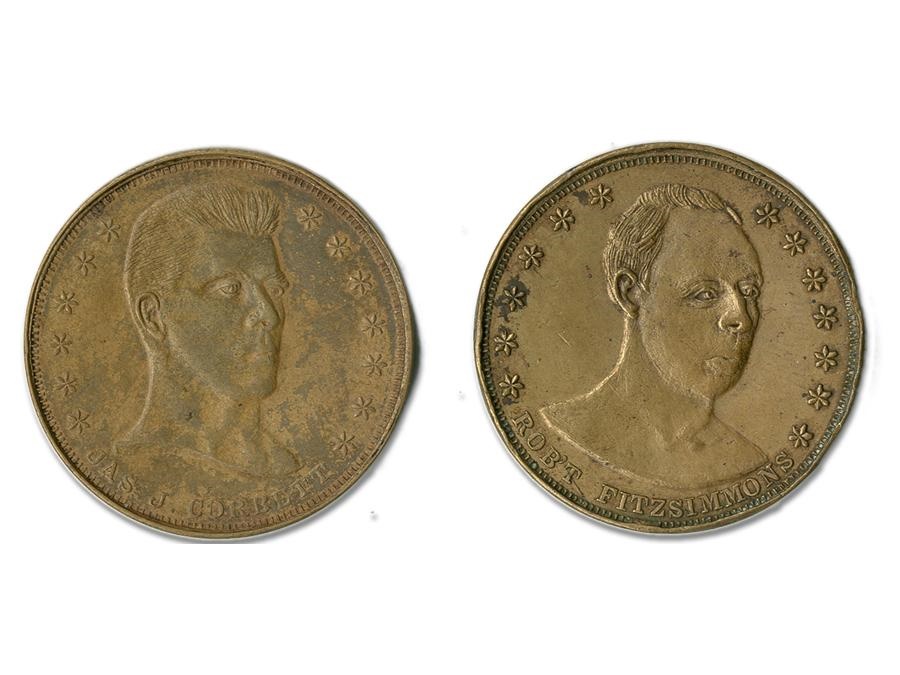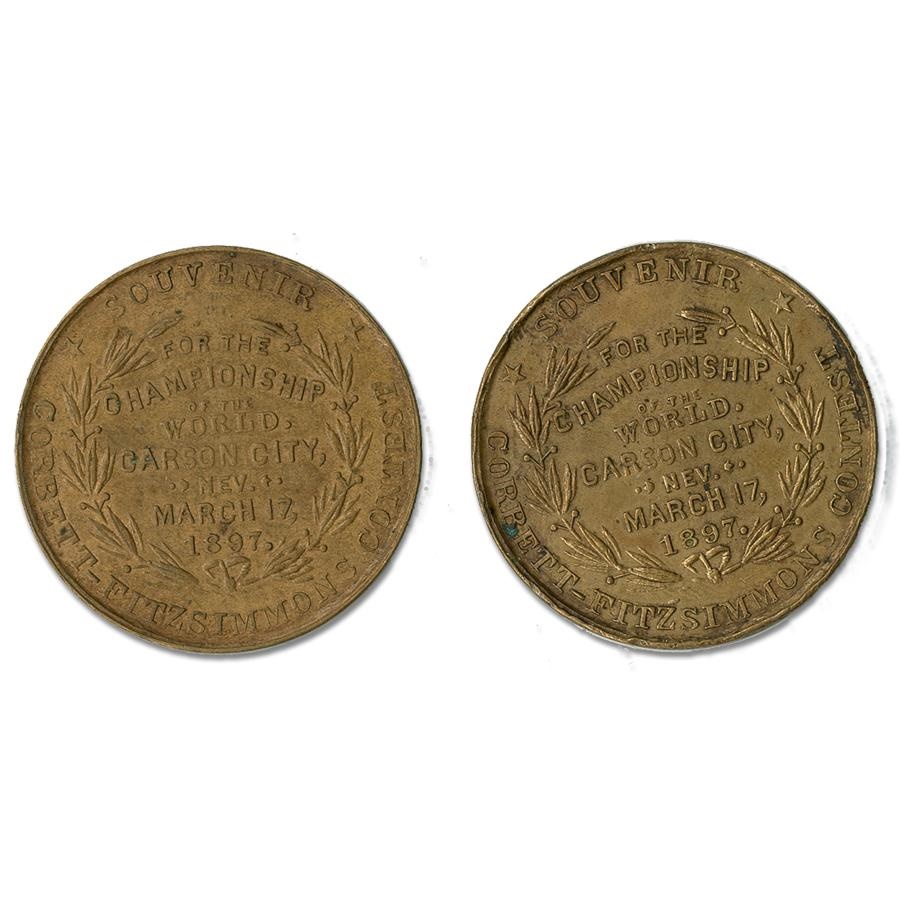 These coins hail from the great battle of Bob Fitzsimmons vs. James Corbett. The coins appear to be made of brass, and are VG-EX with some tarnishing. The front of one coin says, "Jas. J. Corbett", while the front of the other coin says, "Rob't Fitzsimmons". The backs of the two coins are identical, and read, "Souvenir, Corbett-Fitzsimmons Contest, for the Championship of the World, Carson City, Nev. March 17, 1897.