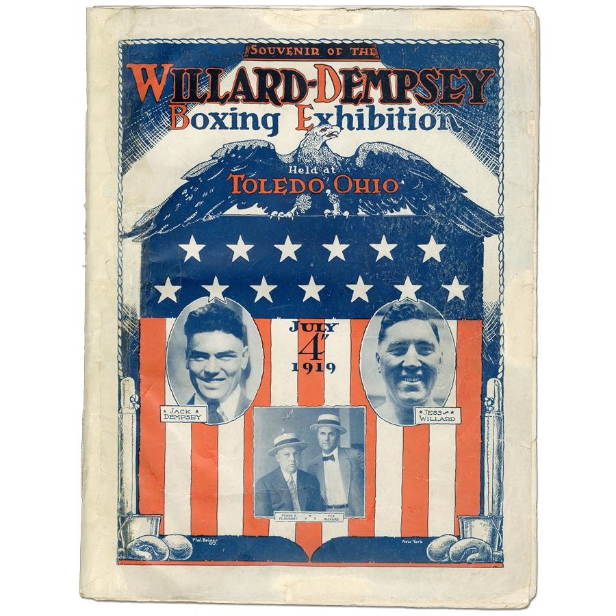 This rare program was sold on-site in Toledo, Ohio, at the Jack Dempsey vs. Jack Willard fight on the 4th of July in 1919. The fight ended with Dempsey becoming the world's champion heavyweight boxer, after initially leaving the ring after the first round because he thought the referee announced him the winner by knock out. He came back to continue fighting Willard for two more rounds, and won. This program was published by F.W. Briggs of New York. The contents are complete and VG. The front and back covers have had some professional restoration, but appear Good.