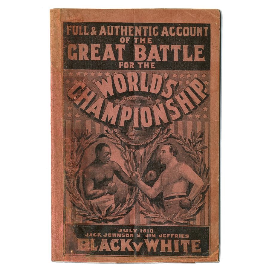 This book provides the reader a rare recap of the great fight of Johnson vs Jeffries. The front cover is VG, with some professional restoration made to it. The inside pages are VG. The front cover reads, "Full & Authentic Account of the Great Battle for the World's Championship, July 1910, Jack Johnson & Jim Jeffries, Black v White". The last few pages talk about the fighters' backgrounds and provide some stats.