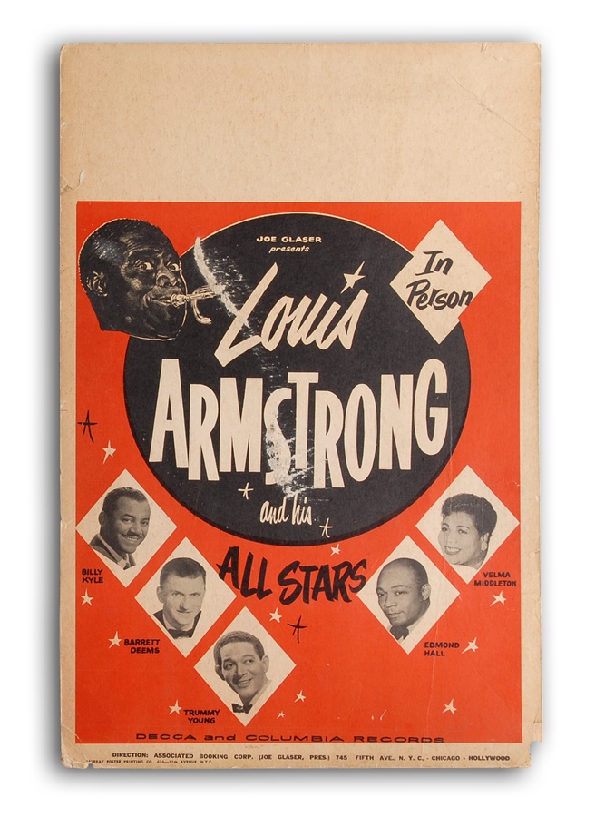Louis Armstrong is considered one of the greatest jazz musicians of all time. The poster shows pictures of "Louis Armstrong and his All Stars", which include Armstrong, Billy Kyle, Barrett Deems, Trummy Young, Edmund Young and Velma Middleton. There is some running of the color, otherwise the item is VG+.