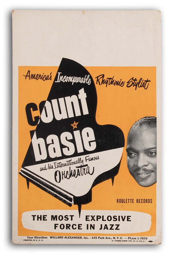 Count Basie was an American jazz pianist, organist, bandleader, and composer. Basie led his jazz orchestra almost continuously for nearly 50 years. The poster communicates a relationship with Roulette Records and calls Basie "The most explosive force in jazz" and "America's Incomparable Rhythmic Stylist". EX.