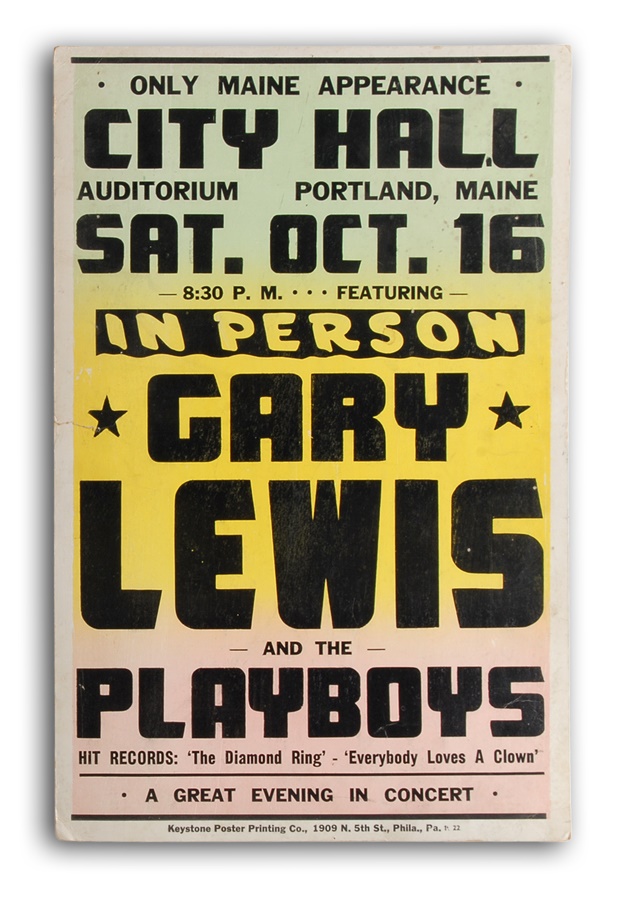 This 14x22" poster of Gary Lewis and the Playboys advertises their "Only Maine Appearance". The hit records mentioned on the bottom of the poster are: "The Diamond Ring" and "Everybody Loves A Clown". The poster is a little faded, but shows a rainbow of hues from pink, to yellow, to mint green. There is a small tear on the left side, but it is otherwise EX+.