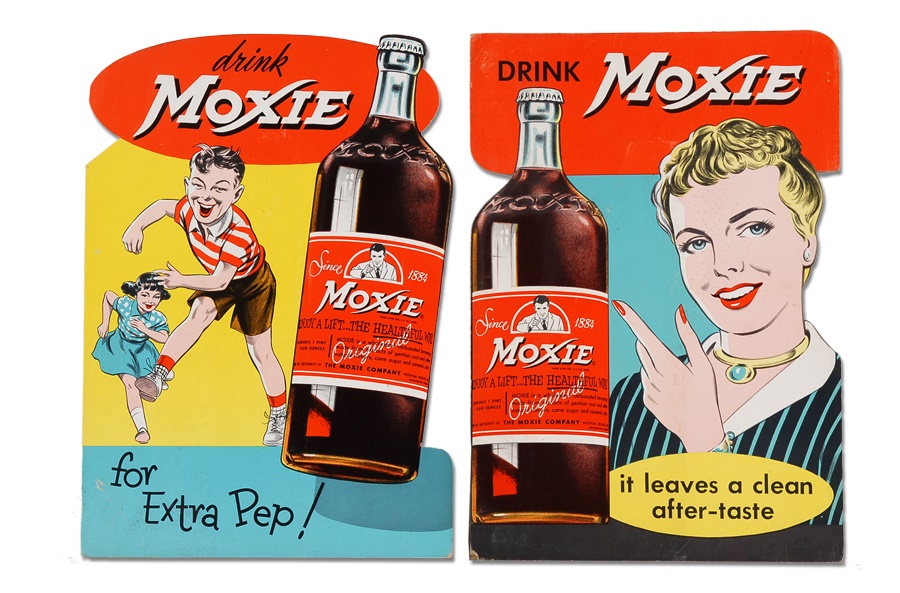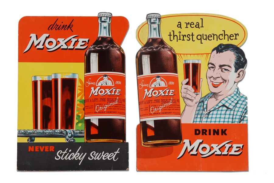 We have never before seen the likes of this group of four die-cut cardstock counter displays for Moxie beverages. All four are in like-new condition - the easels have never been punched and the colors are bright and beautiful - with some corner bends and paper loss typical for items of this age. These store stock displays measure 13.5x19".