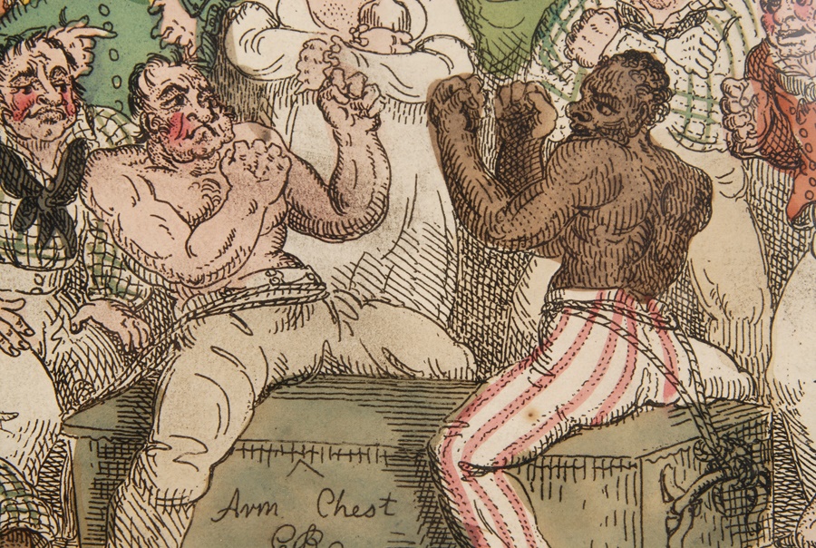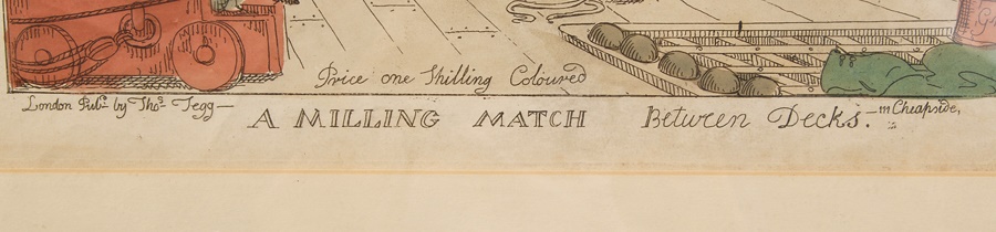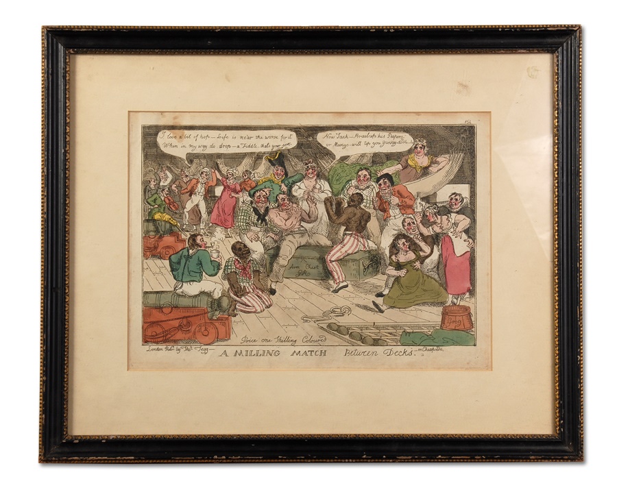 This piece, dating from the very late 1700's- early 1800's, was created and colored by artist Thomas Tegg. The very early boxing piece is in its original period frame, and measures 16.75x20.75". The bottom of the piece says, "London Pub, A Milling Match, Between Decks". Above this it reads, "Price One Shilling Coloured". The piece features black and white boxers, and is 100% original and authentic.