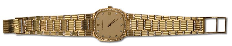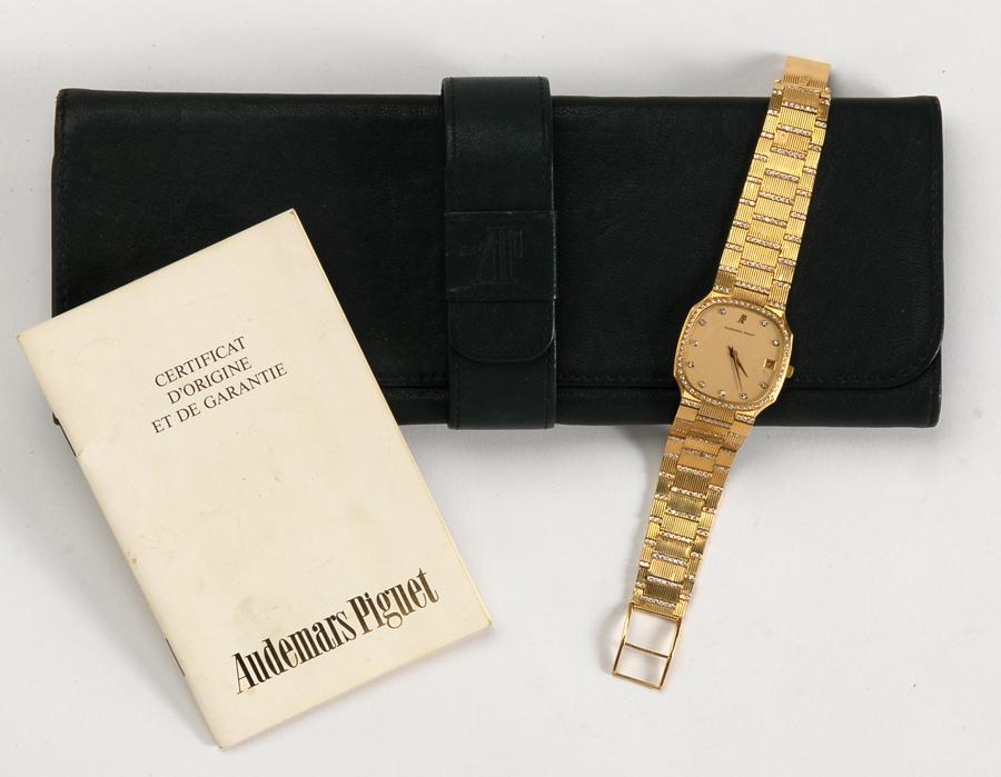 This elegant Audemars Piguet watch is made of 18k gold with original factory-installed diamonds on both the face and band. The diamonds are of exceptional quality as the Switzerland-based manufacturer uses only top-quality stones. The band is all original and 18k gold as well. High-grade, Swiss-made movement keeps perfect time and comes with calendar face. Original green leather box and booklet are included. Both watch and band are in EX condition. The company was established in 1875 and since 1882, members of the Audemars and Piguet families have always been on the board of directors and have thus directly or indirectly run the establishment.