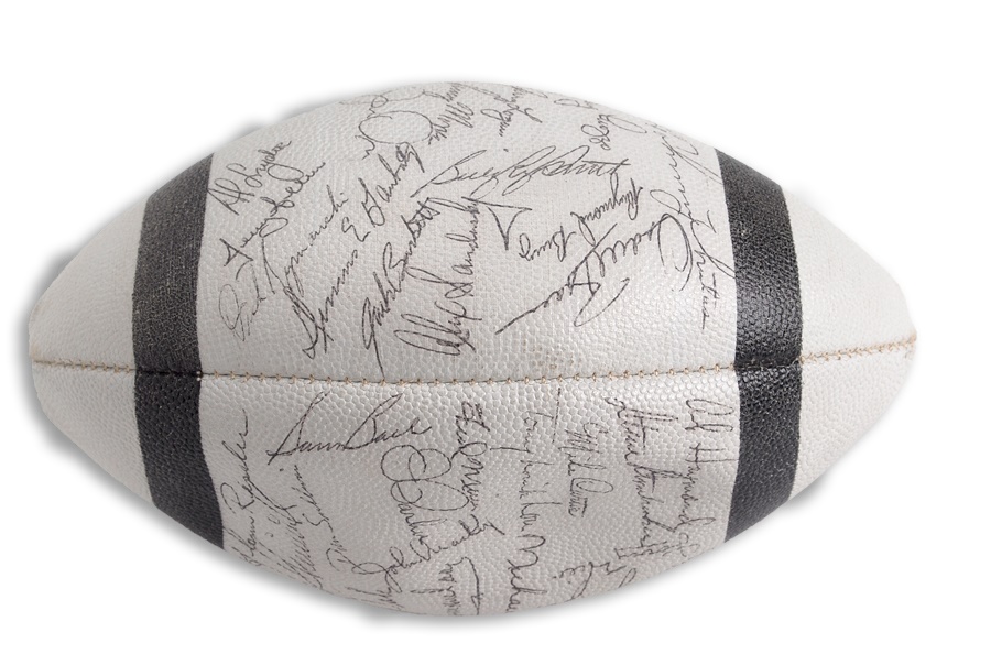 The Baltimore Colts of the 1960's had some of the most celebrated names in NFL history. This white Spalding Johnny Unitas football (includes a facsimile Unitas signature) is NRMT-MT with signatures in black ballpoint pen which average 8/10. This rare piece of memorabilia is decorated with 37 signatures including Johnny Unitas, Raymond Berry, John Mackey, Dan Sullivan, Lou Michaels and more. Signatures in black ink.