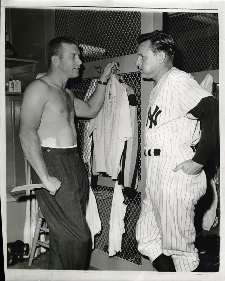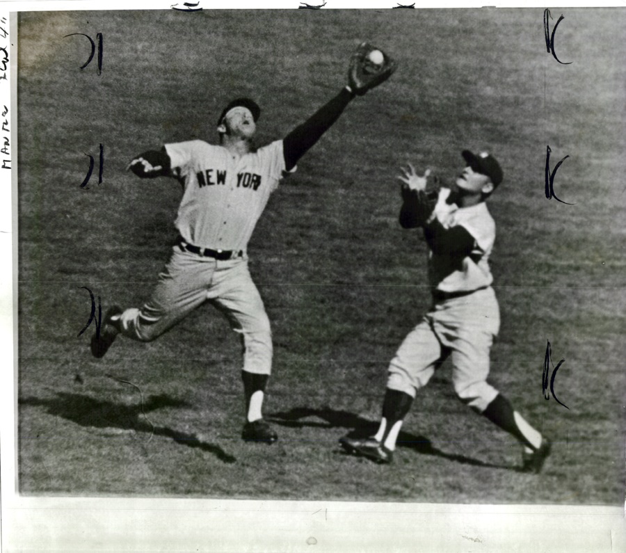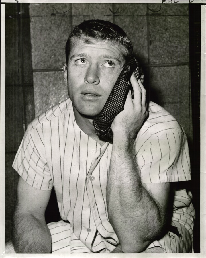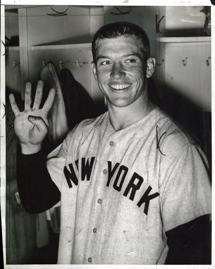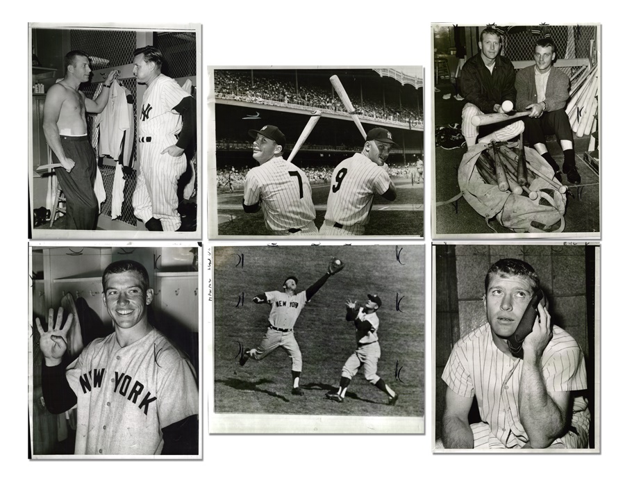 These silver gelatin prints range from 11x12" to 11x14" and were published in the New York Daily Mirror between 1960 and 1962, as seen by the date stamps on the back of the photos. Two prints are smaller (7x9" and 8x10"). A couple of photographs have water stains on the backs of them. The photos show a young Mantle and Maris posing for the camera, and during the World Series in 1960 (photos from Games 1, 2, and 6), and more. The overall condition is VG-EX.