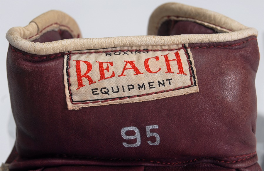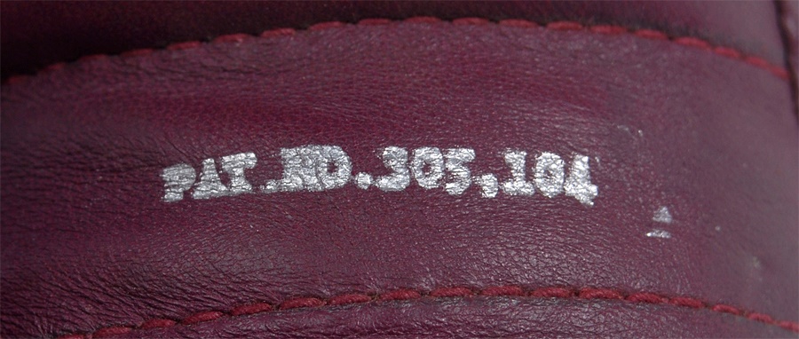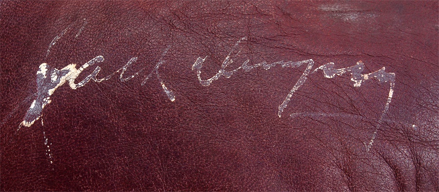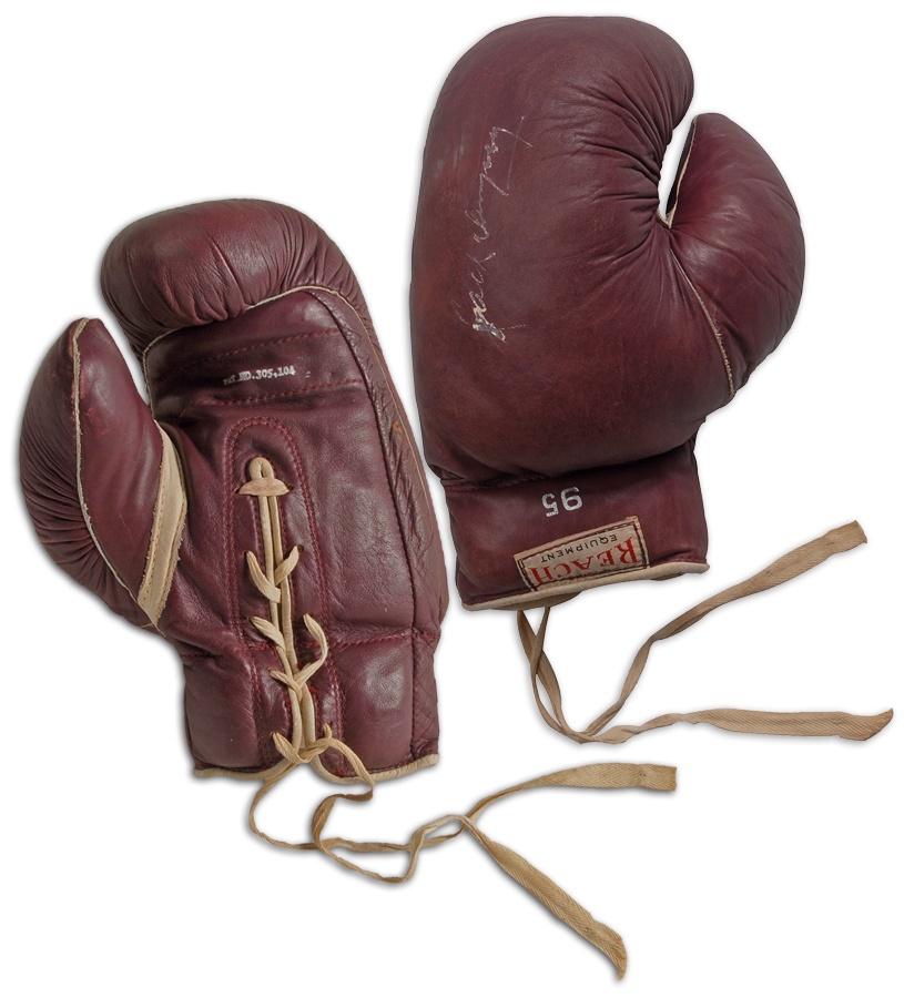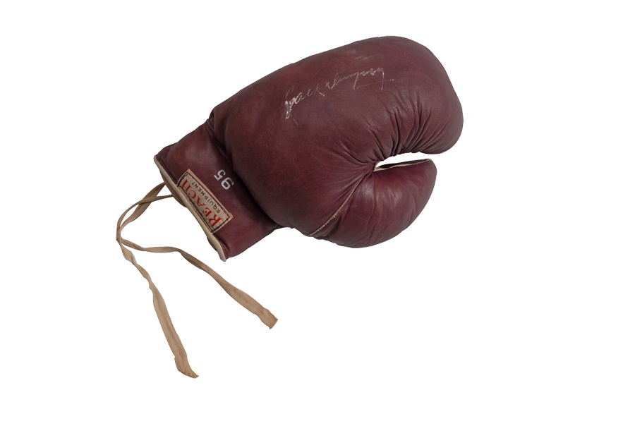 This muted maroon glove has the label "Boxing Reach Equipment" on it, with the number "95" printed in silver. On the inside of the hand is also printed in silver, "Pat. ND., 305, 104". On the outside of the glove, none other than Jack Dempsey himself signed it in white ink. Most of the name has the white paint chipped off, except for the "Ja" in "Jack". The entire name is completely visible.