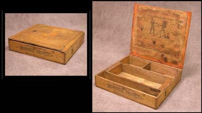 Advertising box for spools features images of these dynamic fighters on the insides lid. Circa 1897 (year of their second bout) point-of-purchase display sat on a general store's counter top way back when. Advertises Russell-Fraser Spools "For Sale Here." Very good. 14x15x3".