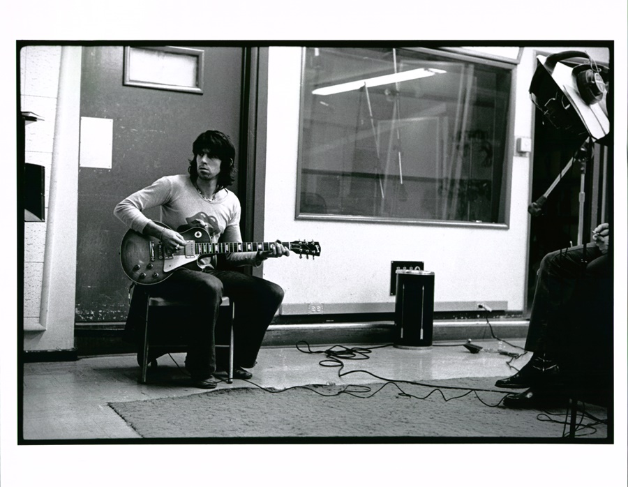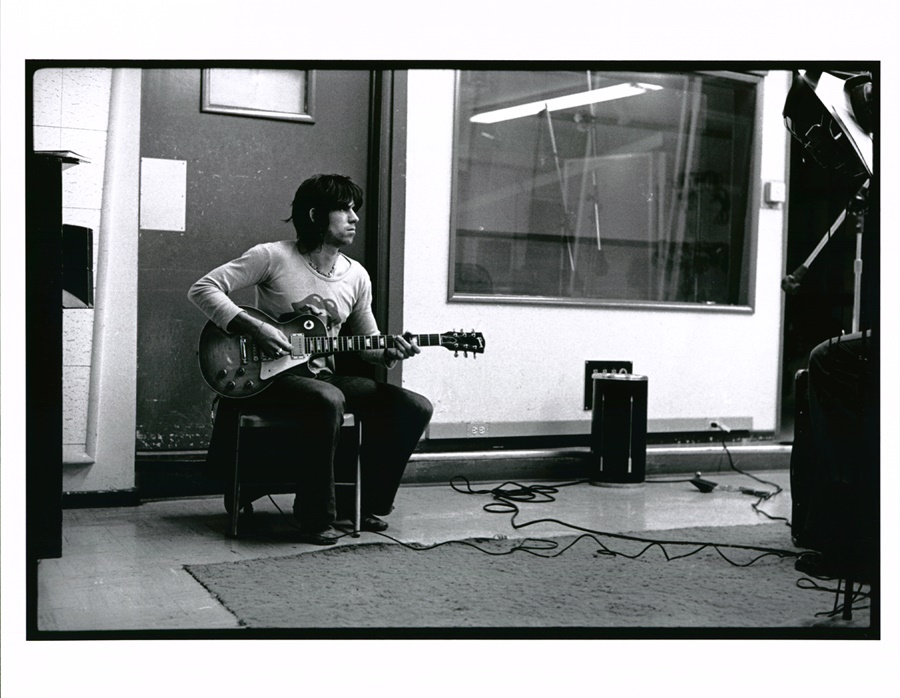 These three photos of legendary Rolling Stones guitarist Keith Richards were taken by photographer Jim Marshall (the Marshall Trademark stamp is on the back of each photo). The three 8x10" black and white photos show Richards playing his guitar while sitting on a folding chair in a recording studio. One shot shows him playing his guitar while simultaneously smoking a cigarette.