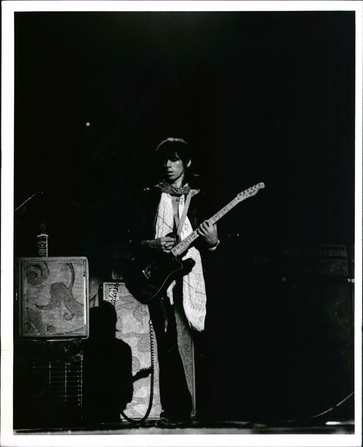 Keith Richards is the legendary guitarist and founding member of The Rolling Stones. This photo from his younger years was taken by Ken Regan, whose stamp is located on the back of this black and white, 8x10" photo of Richards playing his guitar.