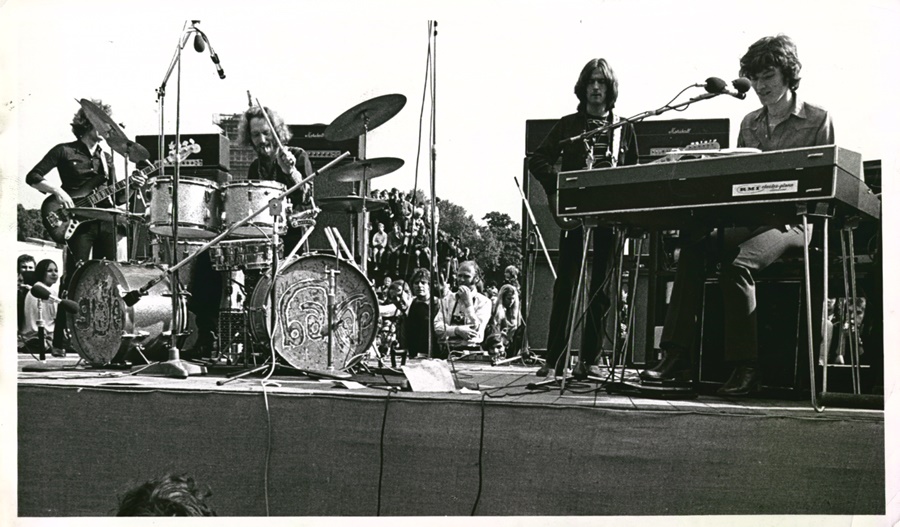 This photo was taken at the Hyde Park Festival in 1969. The shot of the band was taken by David Redom with Eric Clapton, Steve Winwood, and Ginger Baker on stage. 10x6" photo, EX. David Redom stamp is on the back of the photo.